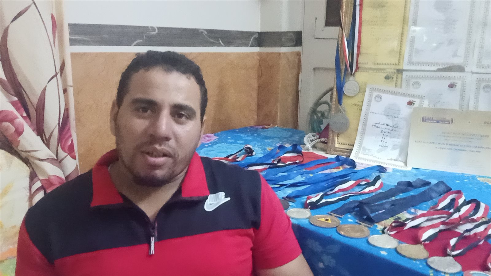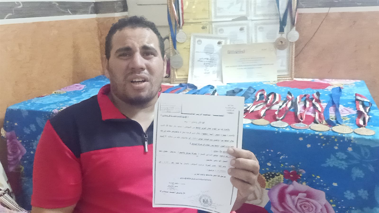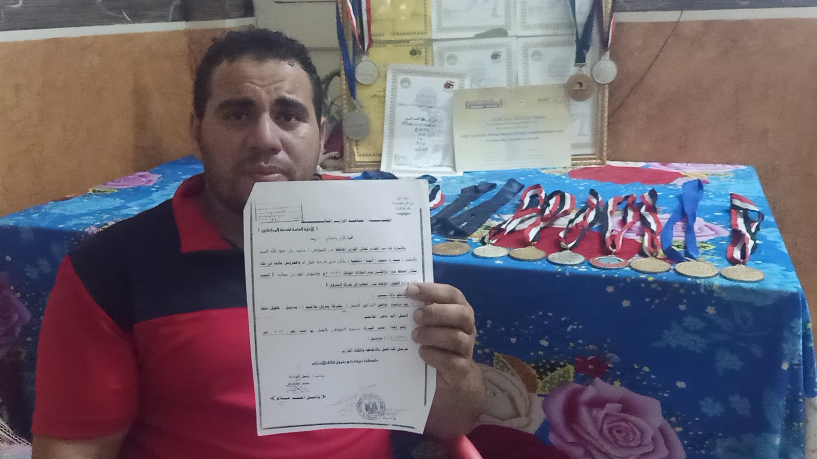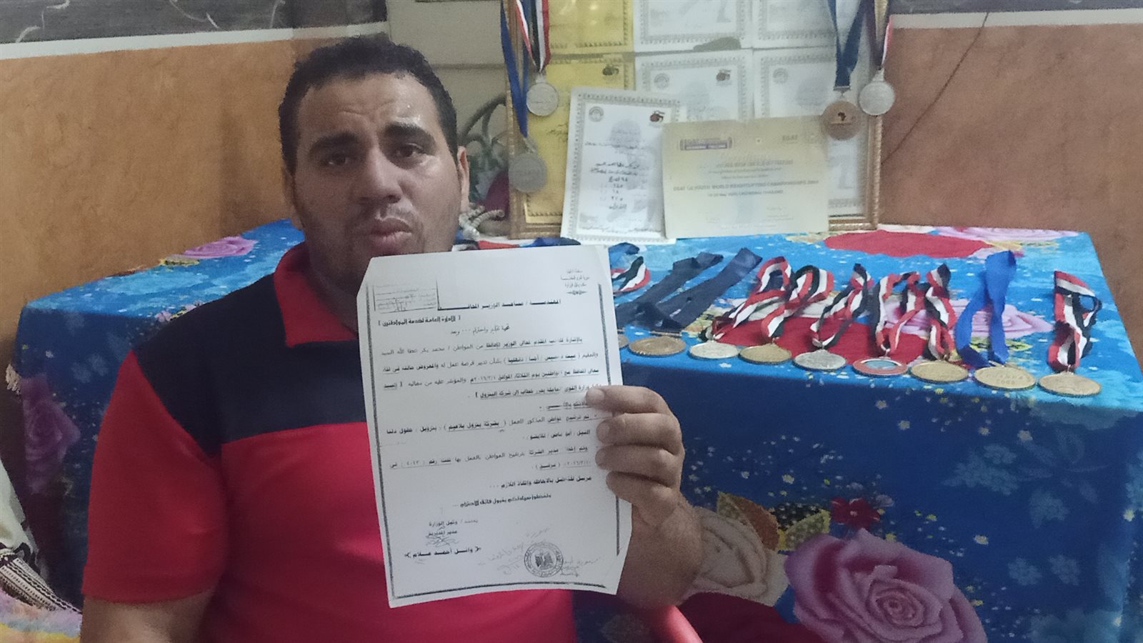 وطالب بطل مصر في رفع الأثقال، المسئولين بالوقوف بجانبه من أجل حياه كريمة، بعد ابتعاده عن المشاركة في المسابقات الدولية والتي طالما رفع علم مصر من خلالها في أكثر من دولة، مناشدًا الرئيس السيسي ووزير الشباب والرياضة ومحافظ الدقهلية وكافة المسئولين في إيجاد فرصة عمل له ومعاش شهري حتى يستطيع الإنفاق على أسرته وممارسة حياته بصورة طبيعية نظرًا لأنه الولد الوحيد العائل لأسرته ووالده المسن و7 شقيقات، ولا يوجد مَن يتكفل بهم أو يساعده في معيشتهم.