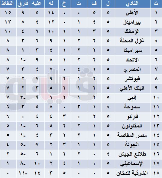 ويتربع الأهلي على قمة جدول ترتيب الدوري الممتاز برصيد 15 نقطة، ويليه بيراميدز ثانيا برصيد 13 نقطة ثم الزمالك ثالثا برصيد 10 نقاط بعد نهاية الجولة الخامسة.