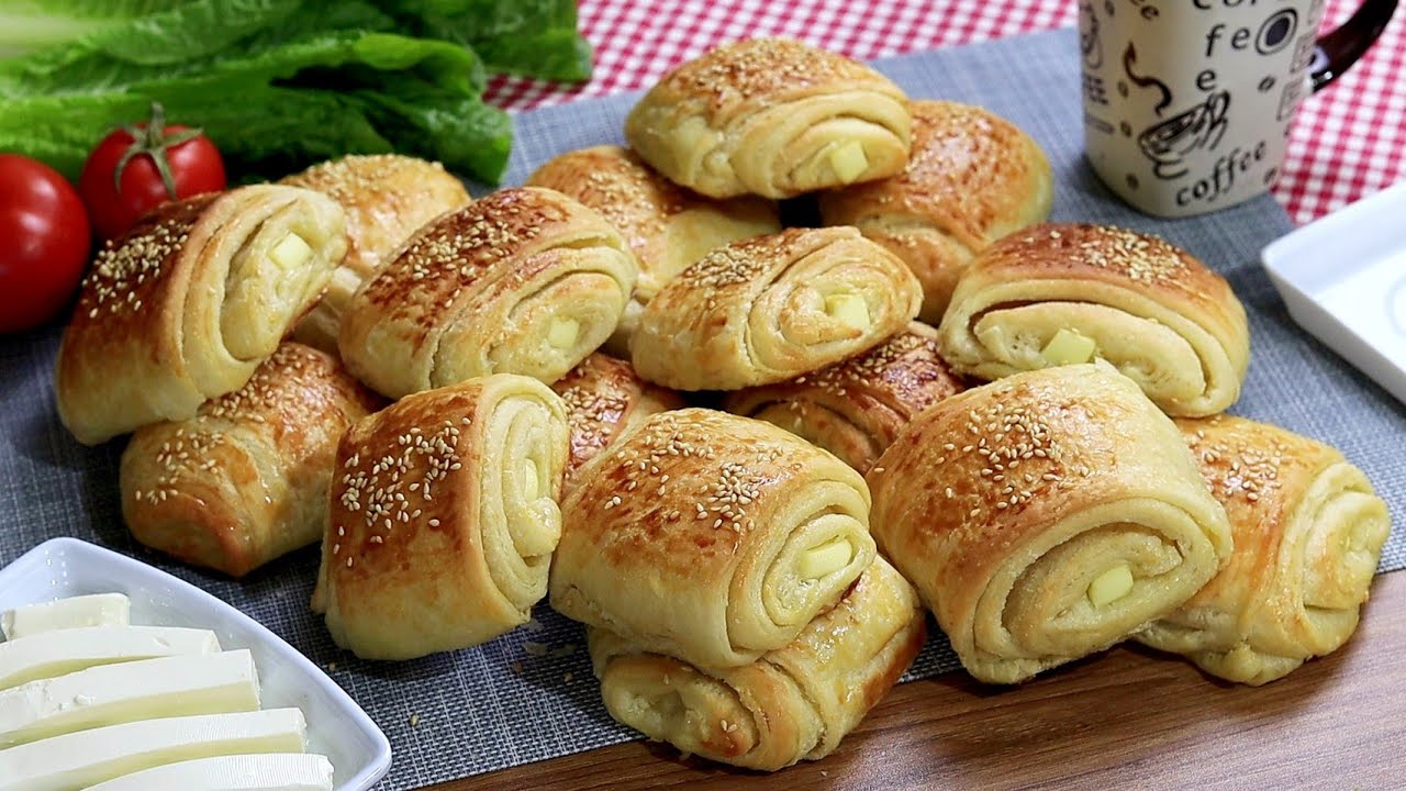 - ثم تفرد وتحشي بأي نوع جبن وتلف وتقطع وتدهن بخليط البيض يضاف سمسم