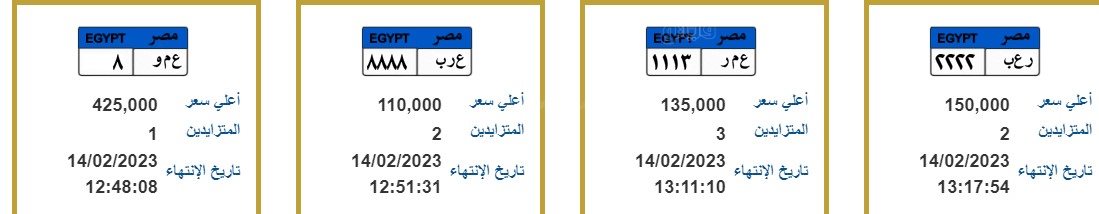 كما طرح لوحات "أ م ل 8888" بسعر 100 ألف جنيه، "ر ه ف 1111" بسعر 120 ألف جنيه، "أ ه م 5" بسعر 455 ألف جنيه، " ن أ ن 777" بقيمة 125 ألف جنيه.
