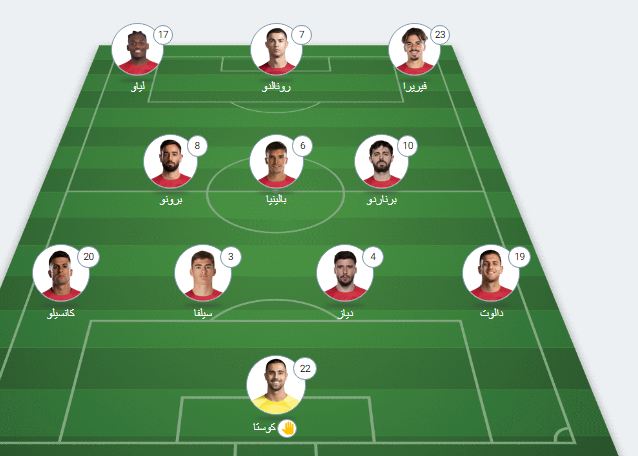 في الهجوم: ريكاردو هورتا (براجا)، رافايل لياو (ميلان)، جواو فيليكس (أتلتيكو مدريد)، كريستيانو رونالدو (النصر)، بيدرو نيتو (ولفرهامبتون)، جونسالو راموس (باريس سان جرمان)، وديوجو جوتا (ليفربول).