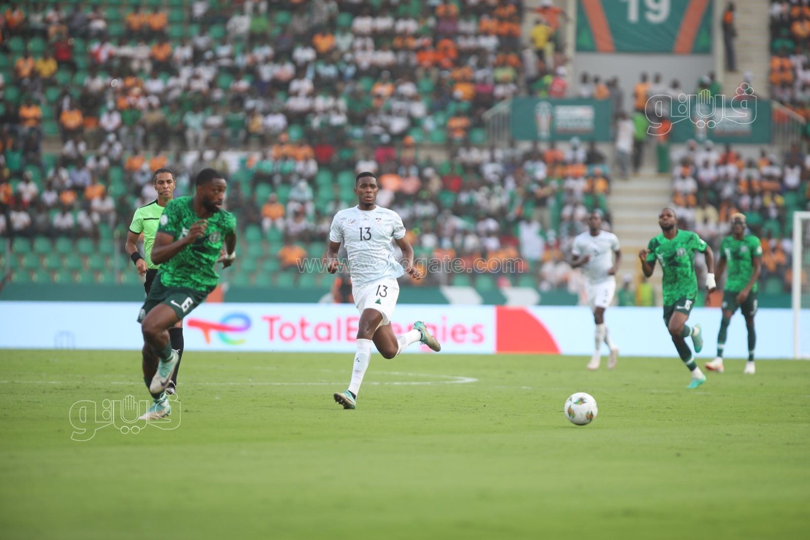وتشهد الدقيقة 53 كرة مشتركة بين تاو ولاعب نيجيريا يسقط تاو، وامين عمر يشير بمواصلة اللعب