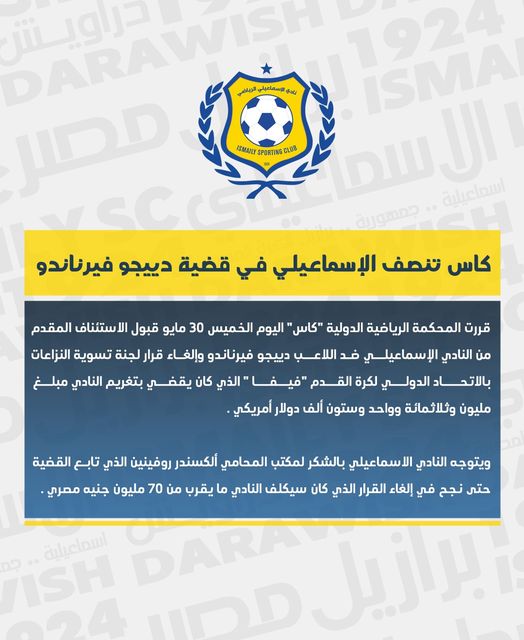ونشر الإسماعيلي عبر صفحته: “قررت المحكمة الرياضية الدولية " كاس ” اليوم الخميس 30 مايو قبول الاستئناف المقدم من النادي الإسماعيلي ضد اللاعب دييجو فيرناندو، وإلغاء قرار لجنة تسوية النزاعات بالاتحاد الدولي لكرة القدم فيفا، الذي كان يقضي بتغريم النادي مبلغ مليون وثلاثمائة وواحد وستين ألف دولار أمريكي.