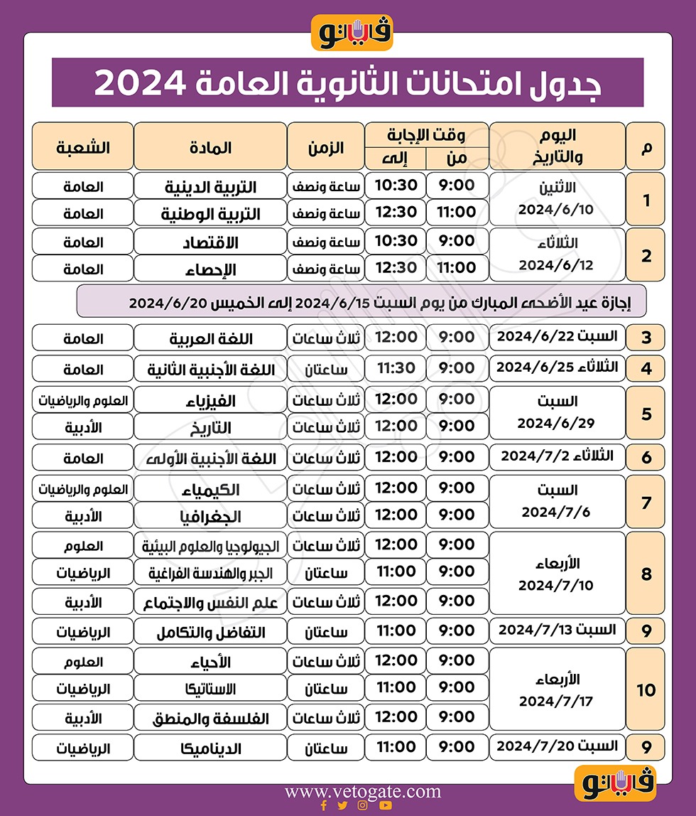 يوم السبت 29 يونيو: الفيزياء للشعبة العلمية، والتاريخ للشعبة الأدبية.