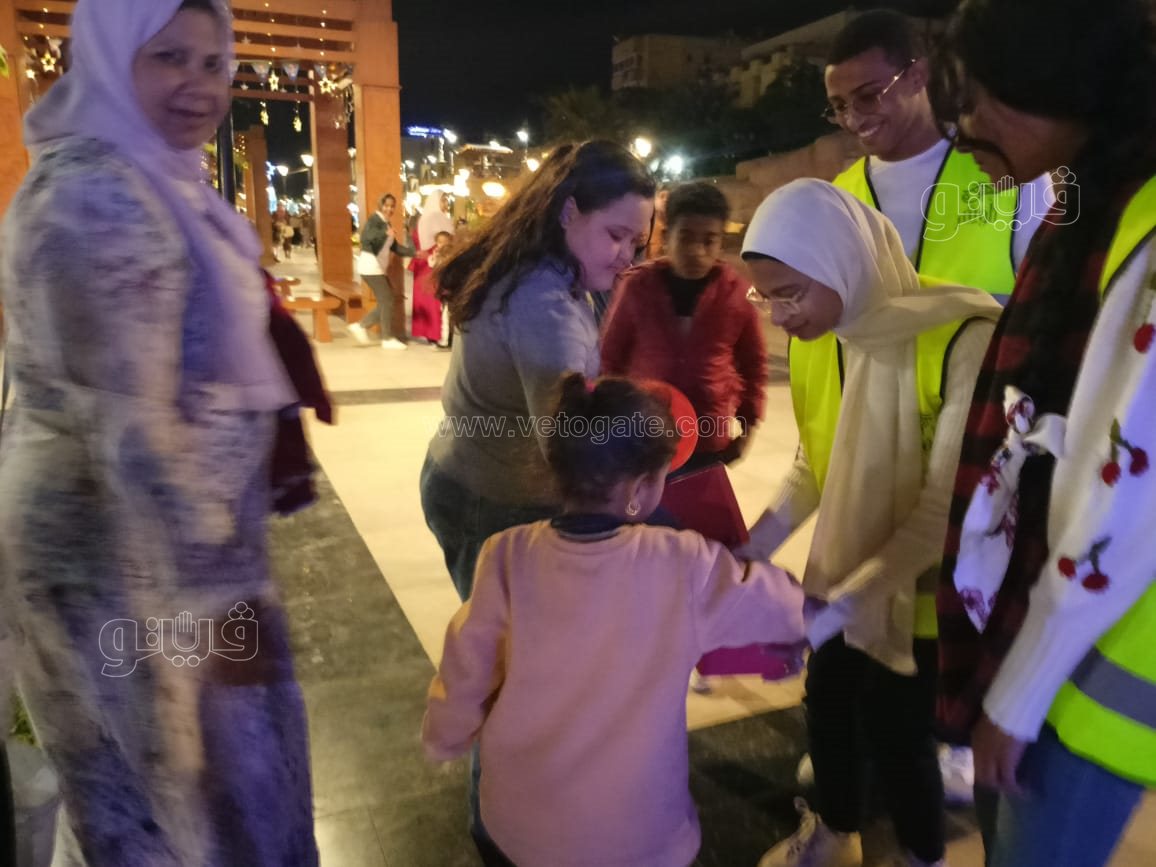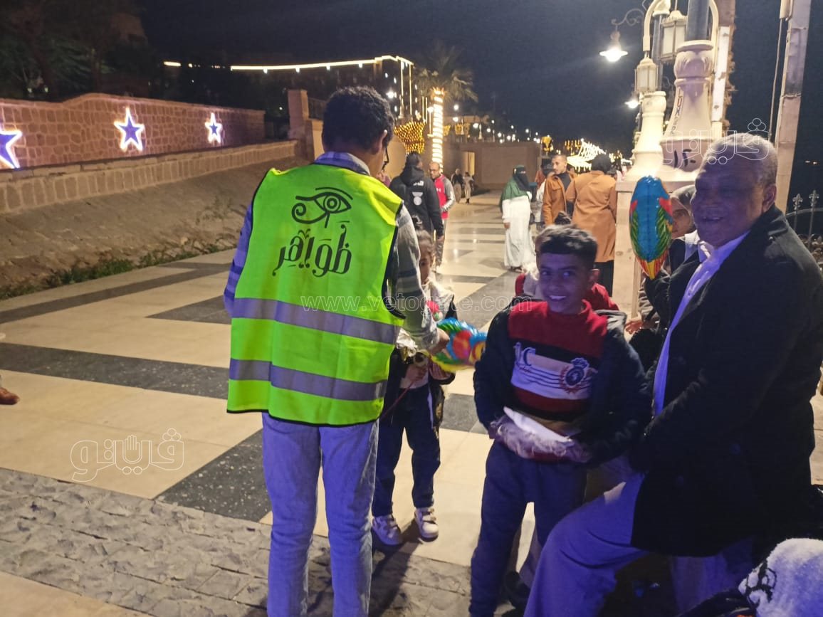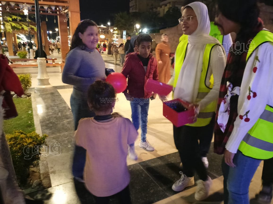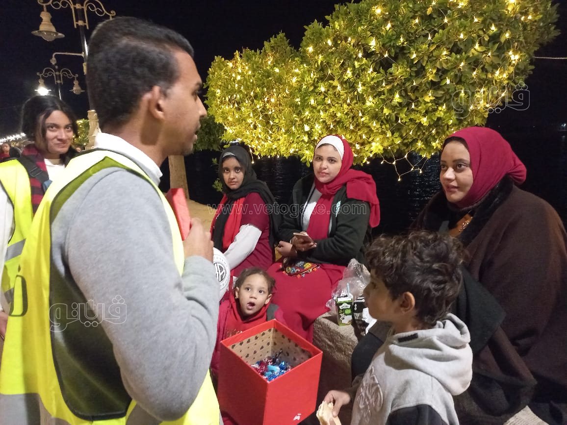 كما حرص شباب مبادرة ظواهر للحد من السلبيات بالمجتمع وتعزيز القيم الإيجابية، على توزيع الهدايا التذكارية على المارة بكورنيش، والتي تضمنت ورود وحلوى والشوكولاته ووجوه بابا نويل على الأطفال.