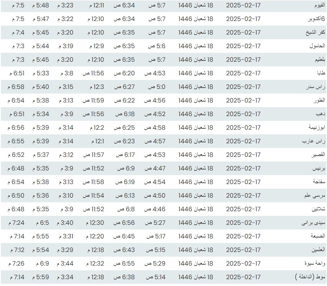 وفيما يلي مواقيت الصلاة، لعدد من مدن ومحافظات الجمهورية من واقع بيانات الهيئة العامة للمساحة