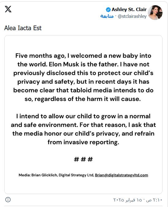 فقد زعمت المؤثرة المحافظة، آشلي سانت كلير، بمنشور على حسابها بمنصة إكس، مساء أمس الجمعة أنها أنجبت طفلًا قبل 5 أشهر من مالك تسلا وسبايس إكس.