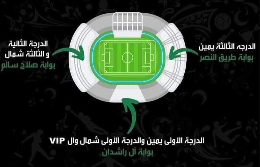 - الدرجتان الأولى يمين والأولى شمال والـvip من بوابة آل رشدان.