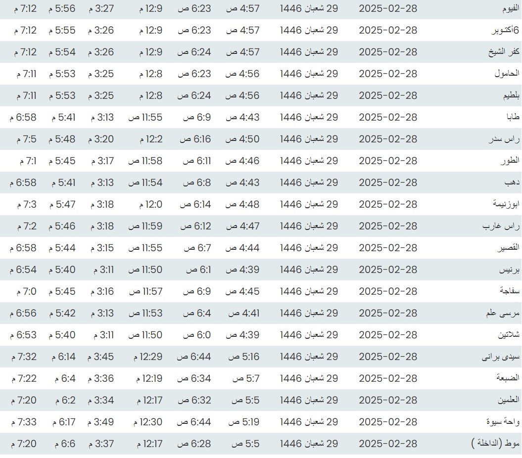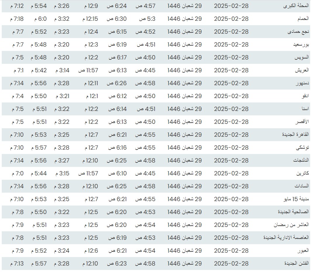 وفيما يلي مواقيت الصلاة، لعدد من مدن ومحافظات الجمهورية من واقع بيانات الهيئة العامة للمساحة