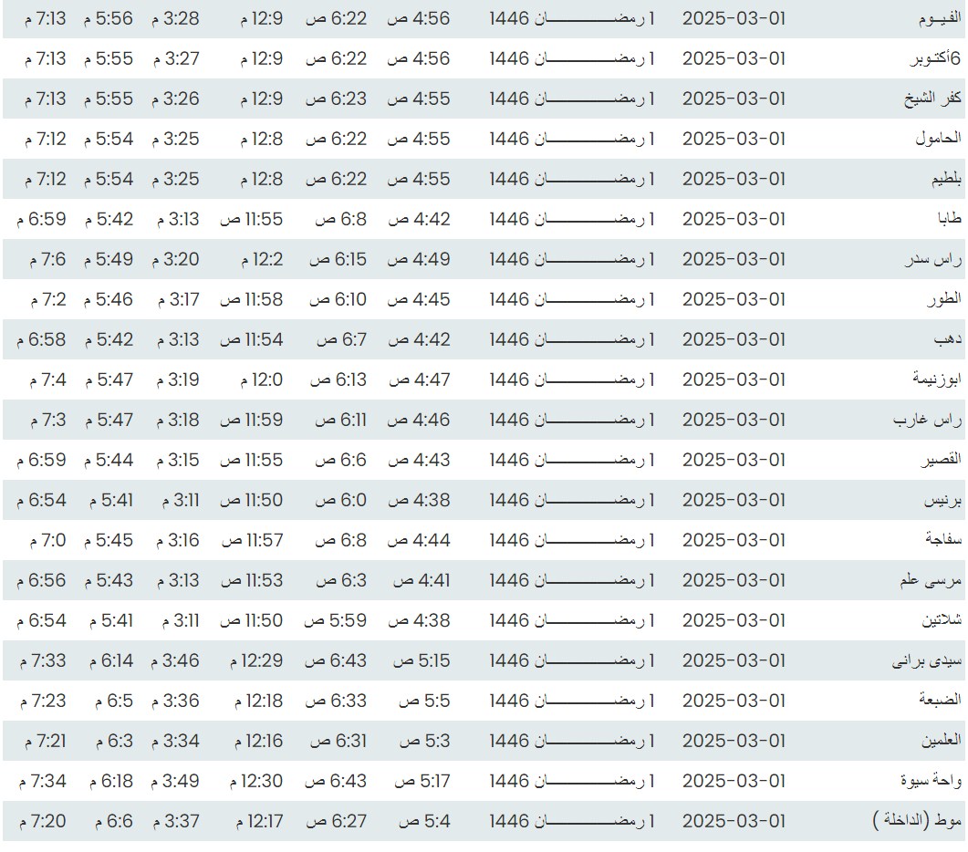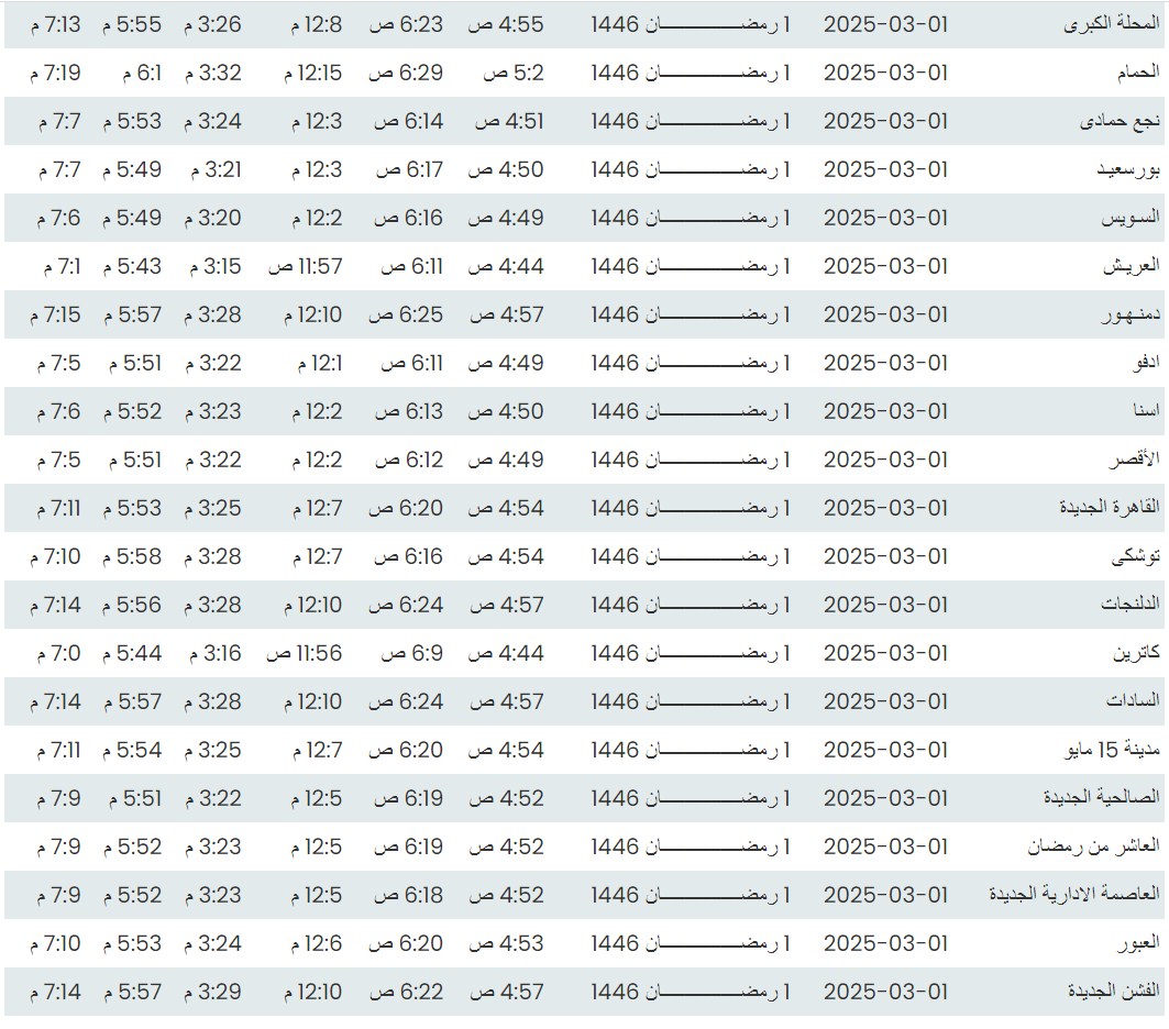 وفيما يلي مواقيت الصلاة، لعدد من مدن ومحافظات الجمهورية من واقع بيانات الهيئة العامة للمساحة