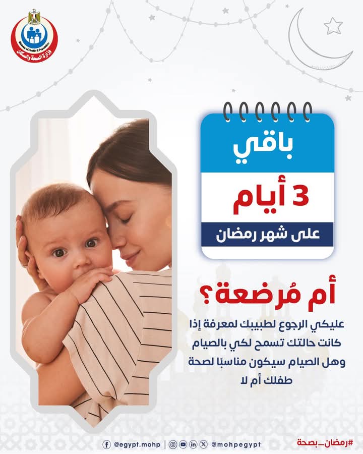 وجهت وزارة الصحة نصائح للسيدات المرضعات بضرورة الرجوع للطبيب لمعرفة إذا كانت الحالة الصحية للمرضعة تسمح بالصيام أم لا.