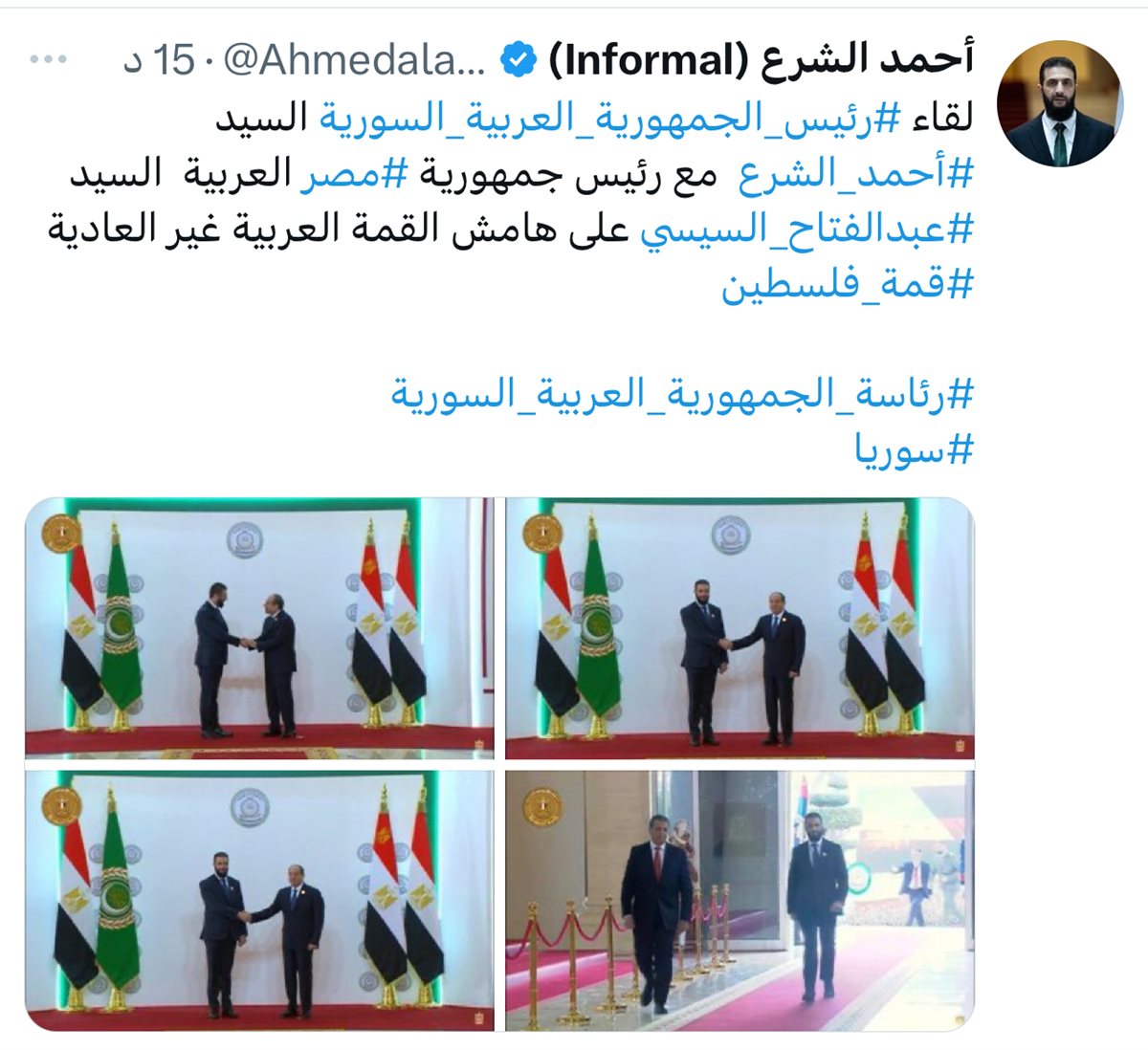 ونشر رئيس المرحلة الانتقالية فى سوريا أحمد الشرع فيديو وعددا من الصور توثق لقاءه مع الرئيس عبد الفتاح السيسى.