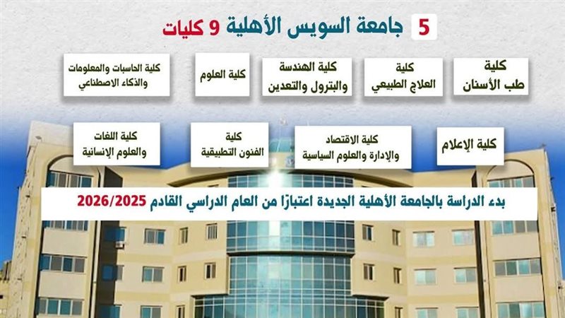 وفي هذا السياق، تعتبر جامعة السويس الأهلية، إحدى الجامعات الأهلية الجديدة التي تمت الموافقة على إنشائها، والتي ستبدأ الدراسة بها اعتبارًا من العام الدراسي 2025/2026، بإجمالي 9 كليات.