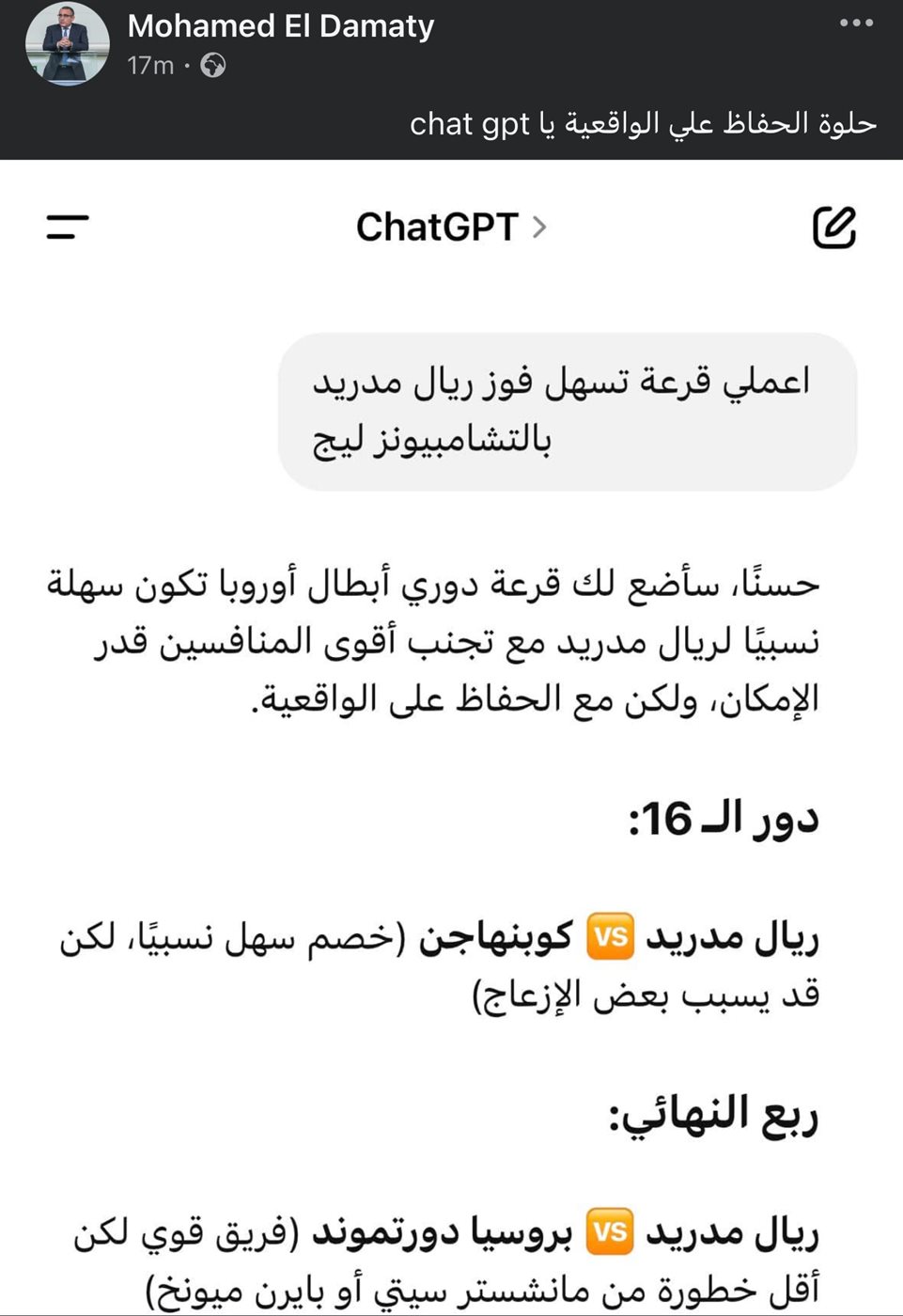 ونشر الدماطي عبر حسابه الشخصي على فيسبوك محادثة مع برنامج chat gpt تحمل في مضمونها عدة أسئلة يقصد من خلالها التعقيب على قرعة الدوري التي أعلنتها رابطة الأندية كما علق على الصوره قائلا: “حلوة الحفاظ على الواقعية يا chat gpt ”.
