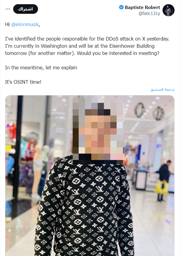 اتهام الباحث الفرنسي بابتست روبرت جاء عبر عدة تغريدات وجهها للملياردير الأمريكي إيلون ماسك، قال فيها "مرحبا إيلون ماسك، لقد حددت هوية الأشخاص المسؤولين عن هجوم DDoS على X أمس، أنا موجود حاليًا في واشنطن وسأكون في مبنى أيزنهاور غدًا (لأمر آخر). هل ترغب في الاجتماع؟ وفي هذه الأثناء، دعني أشرح لقد حان وقت OSINT!".