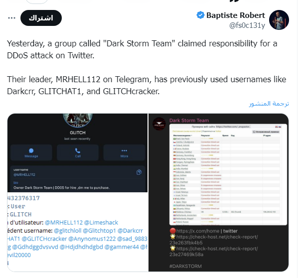 وتابع مدير التحقيقات الفرنسية المتخصّصة في الاستخبارات المفتوحة (OSINT) قائلًا: "أعلنت مجموعة تدعى فريق دارك ستورم "Dark Storm Team" أمس مسؤوليتها عن هجوم DDoS على تويتر. كان زعيمهم، MRHELL112 على Telegram، قد استخدم في السابق أسماء مستخدمين مثل Darkcrr، وGLITCHAT1، وGLITCHcracker."