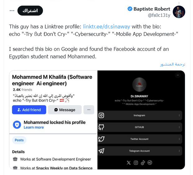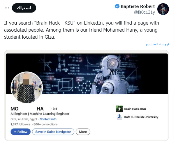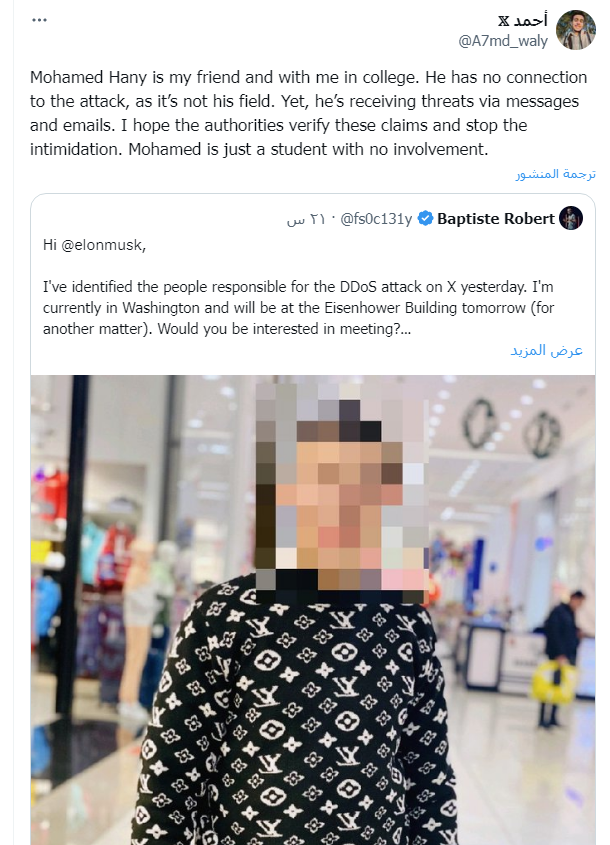 وكتب الرئيس التنفيذي لشركة التحقيقات الفرنسية المتخصّصة في الاستخبارات المفتوحة (OSINT)، ويدعى بابتست روبرت، تغريدة عبر "تويتر"، ادعى فيها أن "الهجمات الإلكترونية التي تعرضت لها منصة "إكس" نفذها طالب جامعي مصري يدعى (م. هـ"، وادعى أن هجمات الطالب الطالب المصري مدعومة من روسيا، وأن الطالب داعم للقضية الفلسطينية.