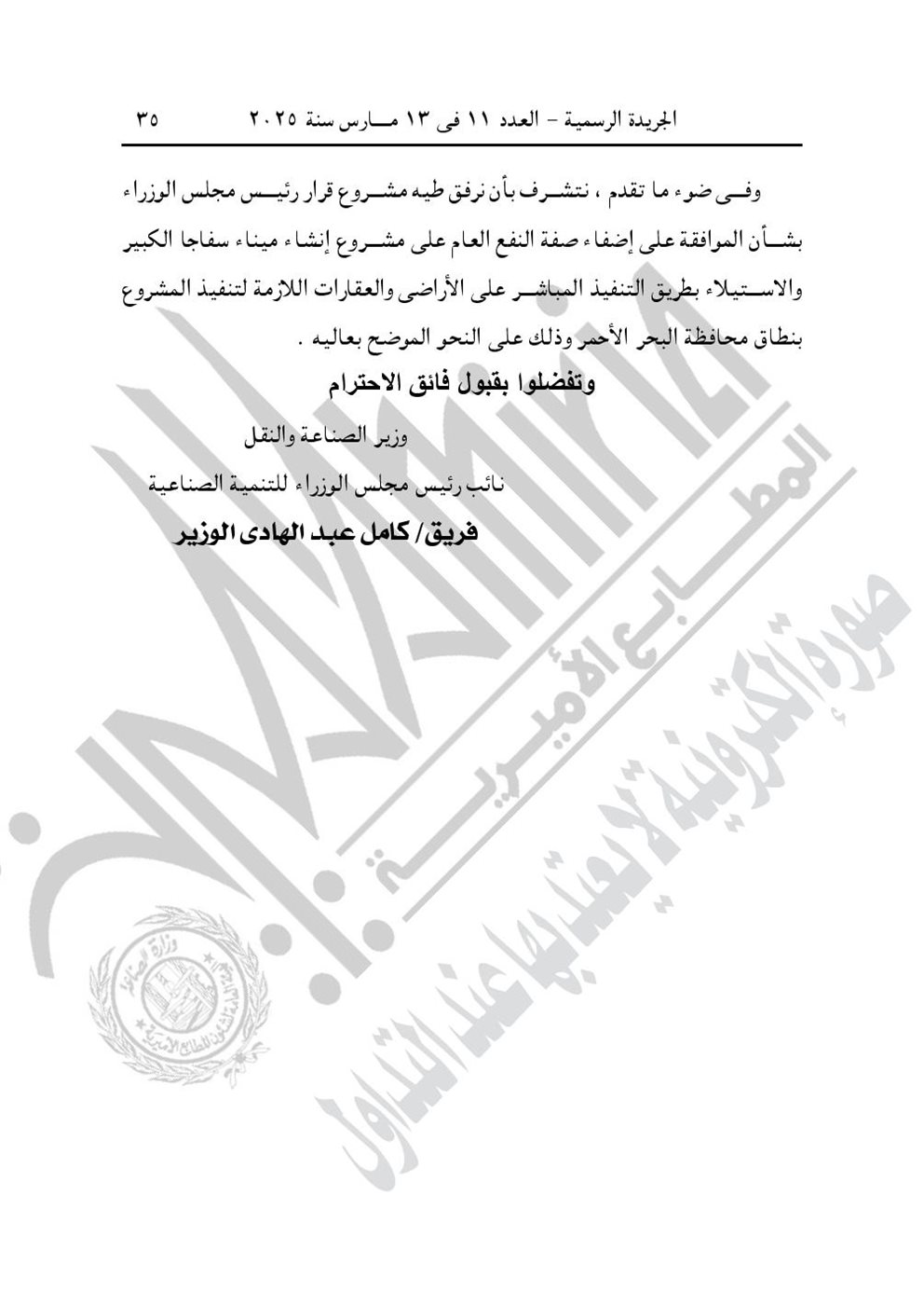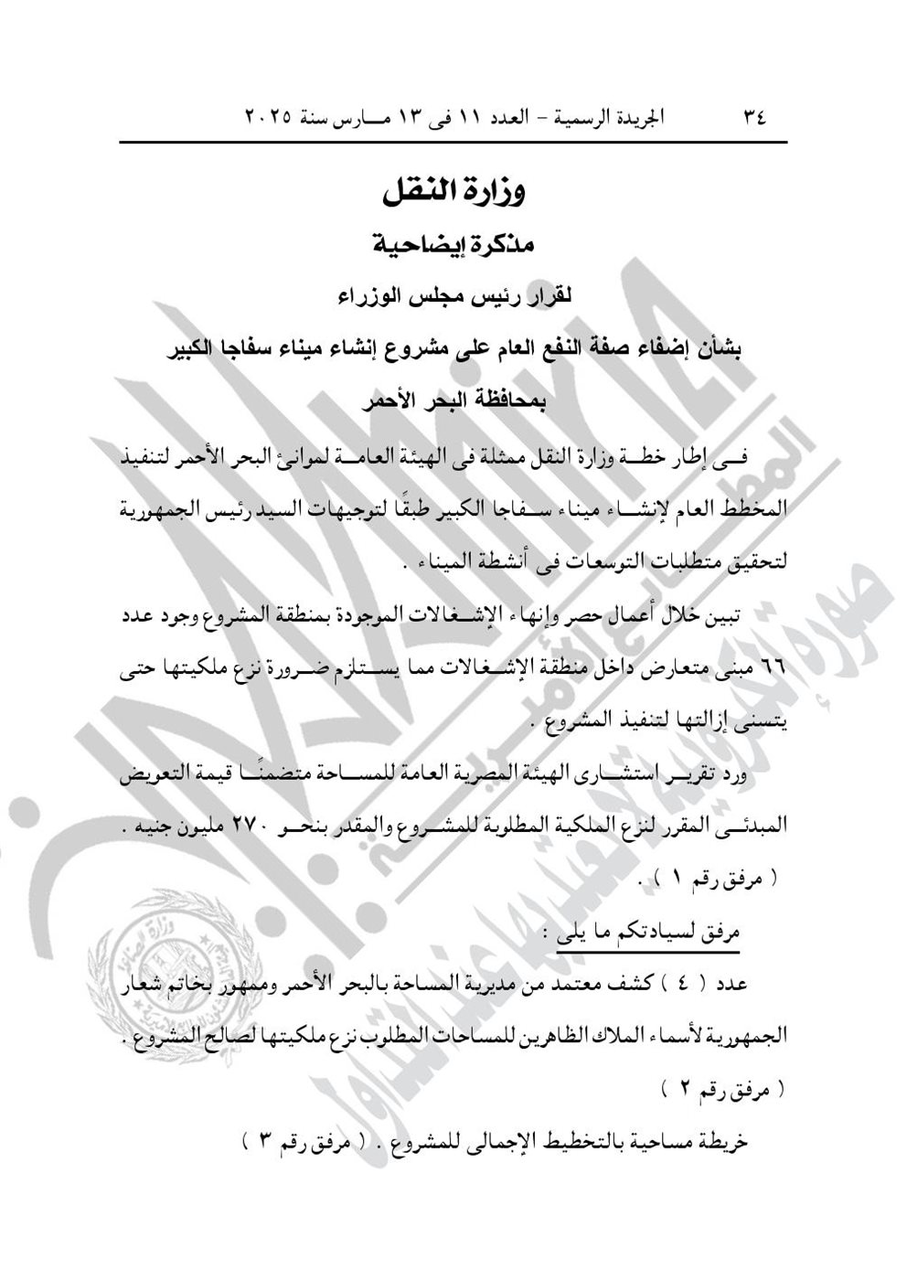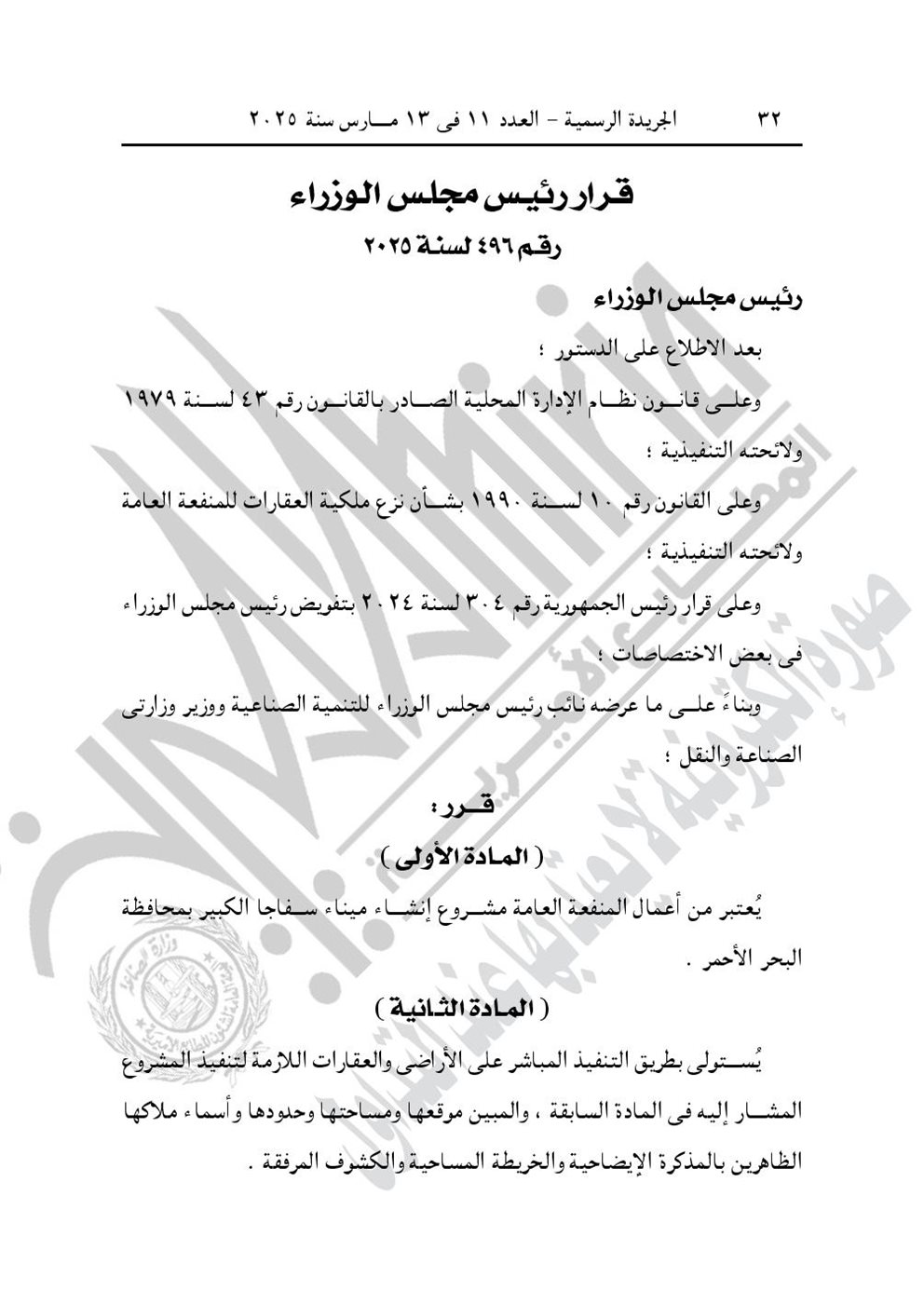 -قرار رئيس الوزراء رقم 496 لسنة 2025، بشأن اعتبار مشروع إنشاء ميناء سفاجا الكبير بمحافظة البحر الأحمر، من أعمال المنفعة العامة.