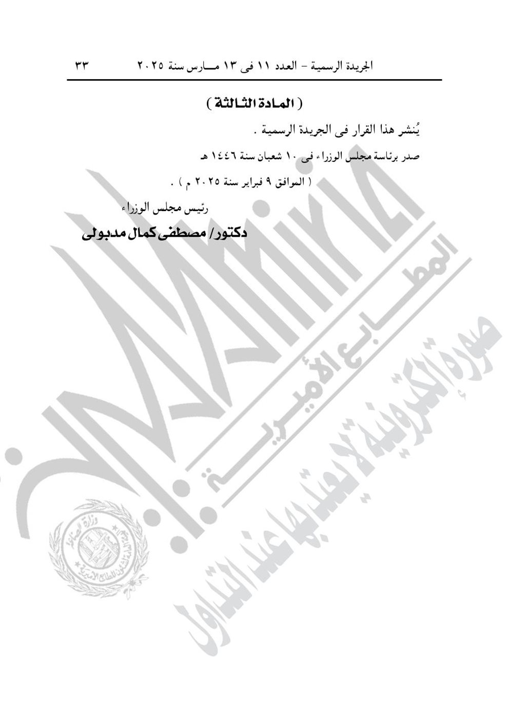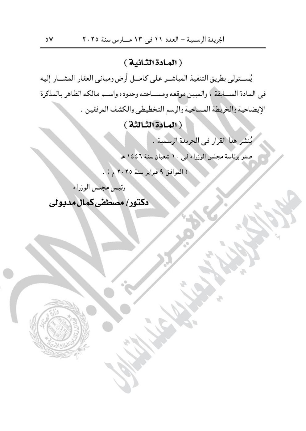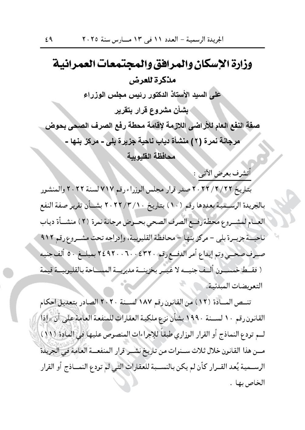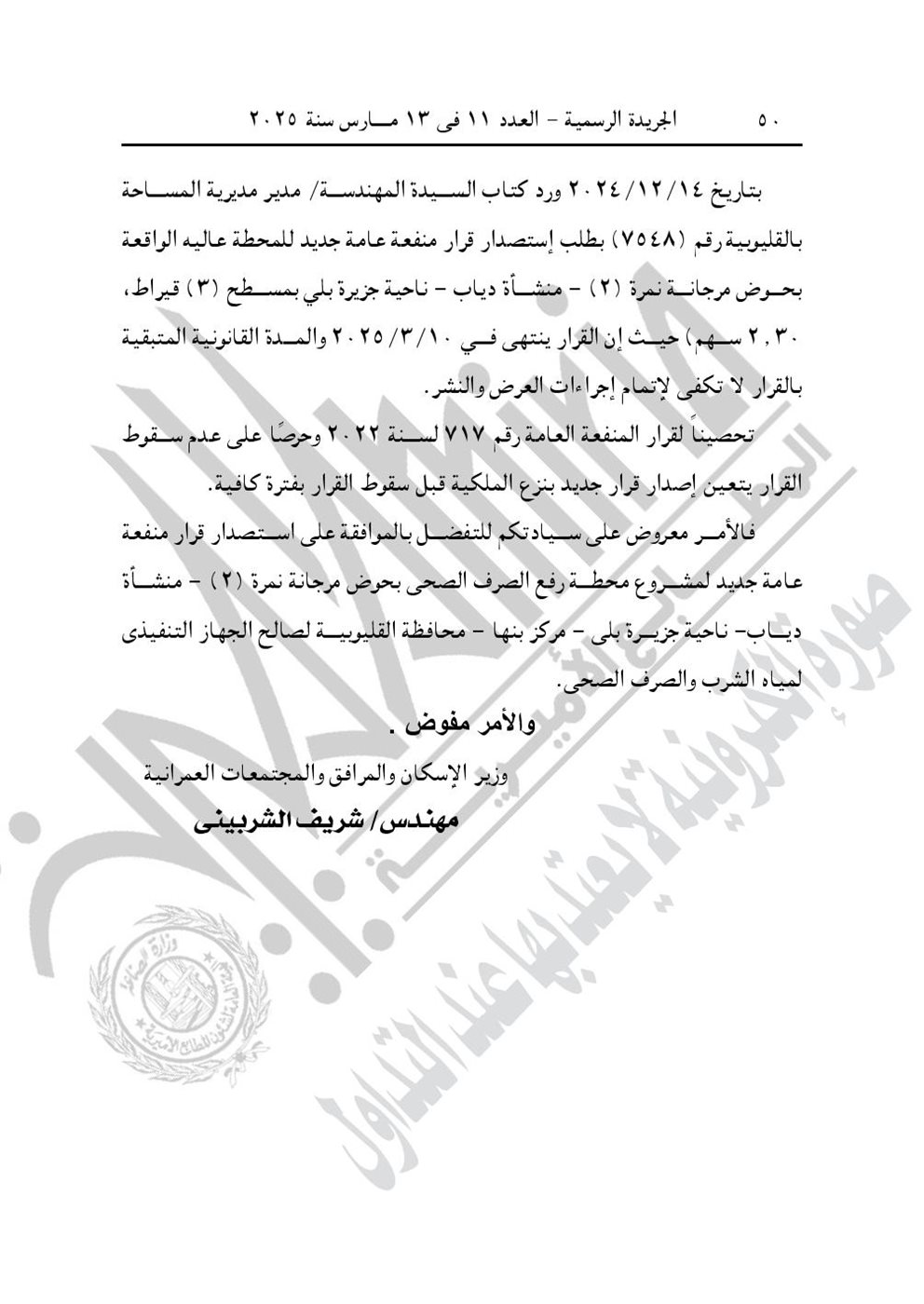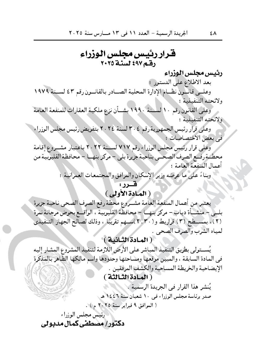 - قرار رئيس مجلس الوزراء رقم 497 لسنة 2025، باعتبار مشروع محطة رفع الصرف الصحى ناحية جزيرة بلى منشأة دياب مركز بنها محافظة القليوبية، الواقع بحوض مرجانة نمرة (2)، بمسطح (3) قراريط و(2٫30) سهم تقريبًا، من أعمال المنفعة العامة، وذلك لصالح الجهاز التنفيذى لمياه الشرب والصرف الصحى.