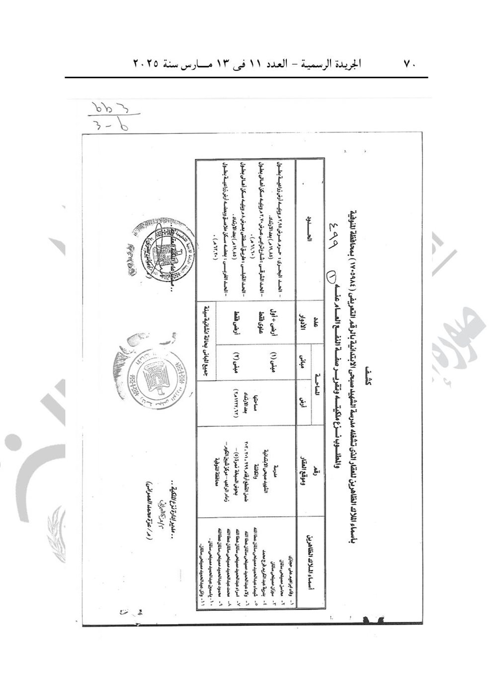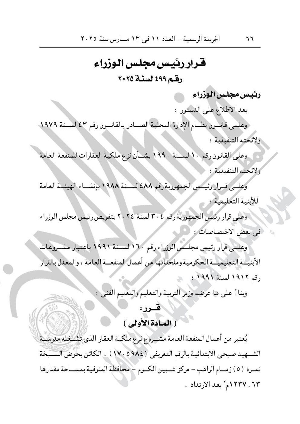 - قرار رئيس مجلس الوزراء رقم 499 لسنة 2025، باعتبار مشروع نزع ملكية العقار الذى تشغله مدرسة الشهيد صبحى الابتدائية، الكائن بحوض السبخة نمرة (5) زمام الراهب، مركز شبين الكوم محافظة المنوفية، من أعمال المنفعة العامة، ويستولى بطريق التنفيذ المباشر على كامل أرض ومبانى العقار.