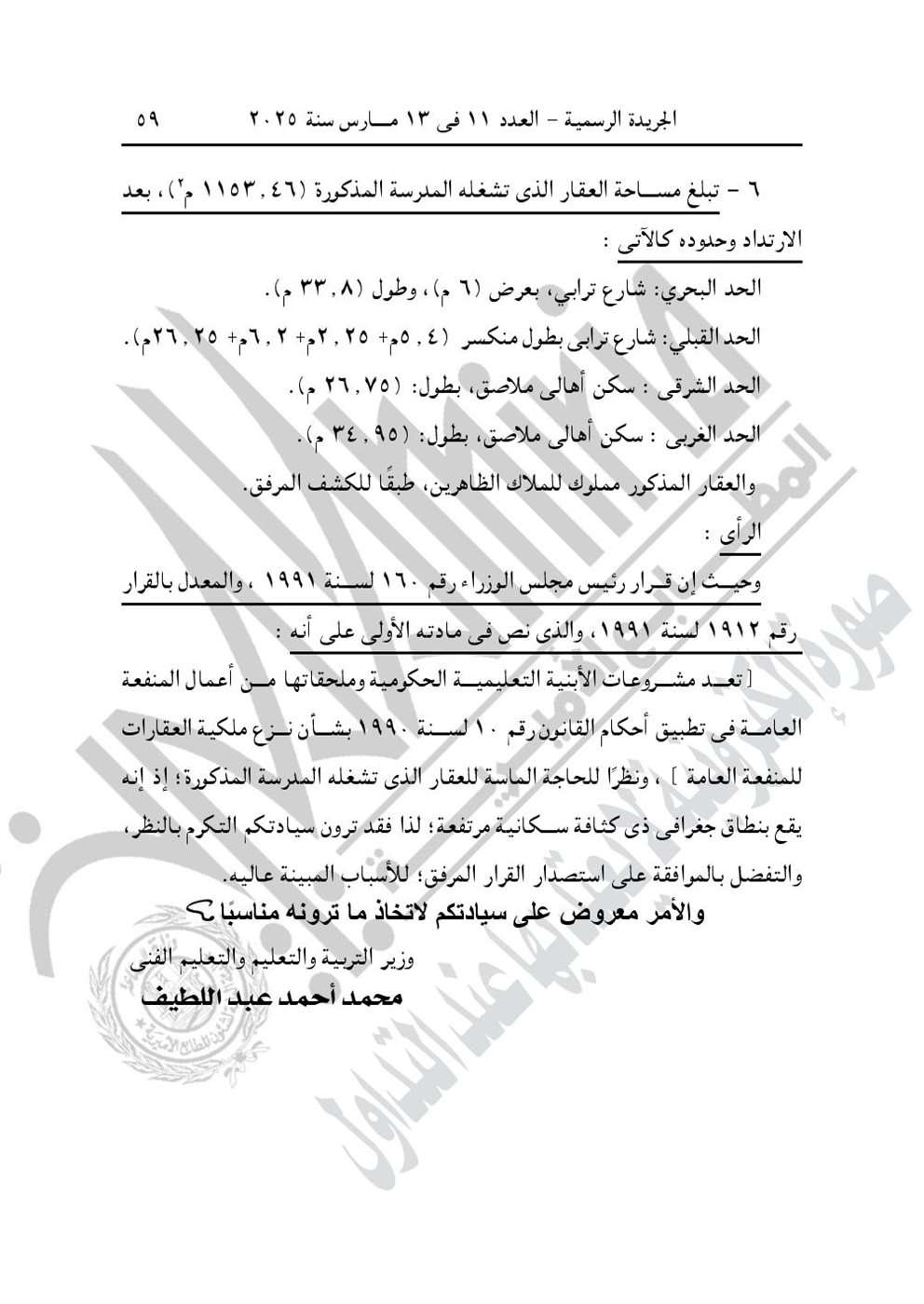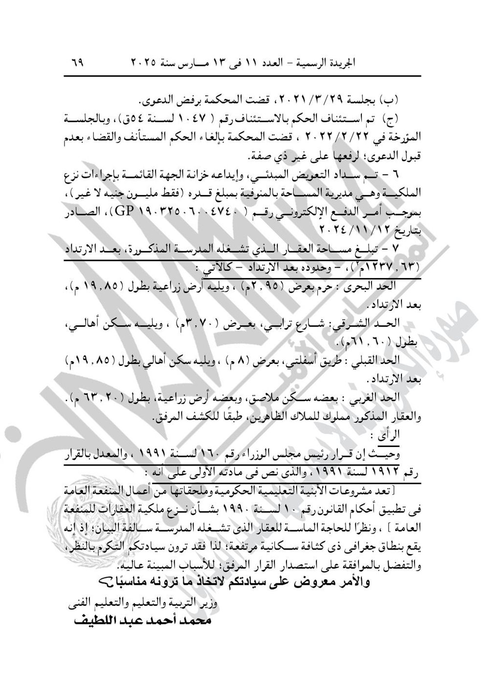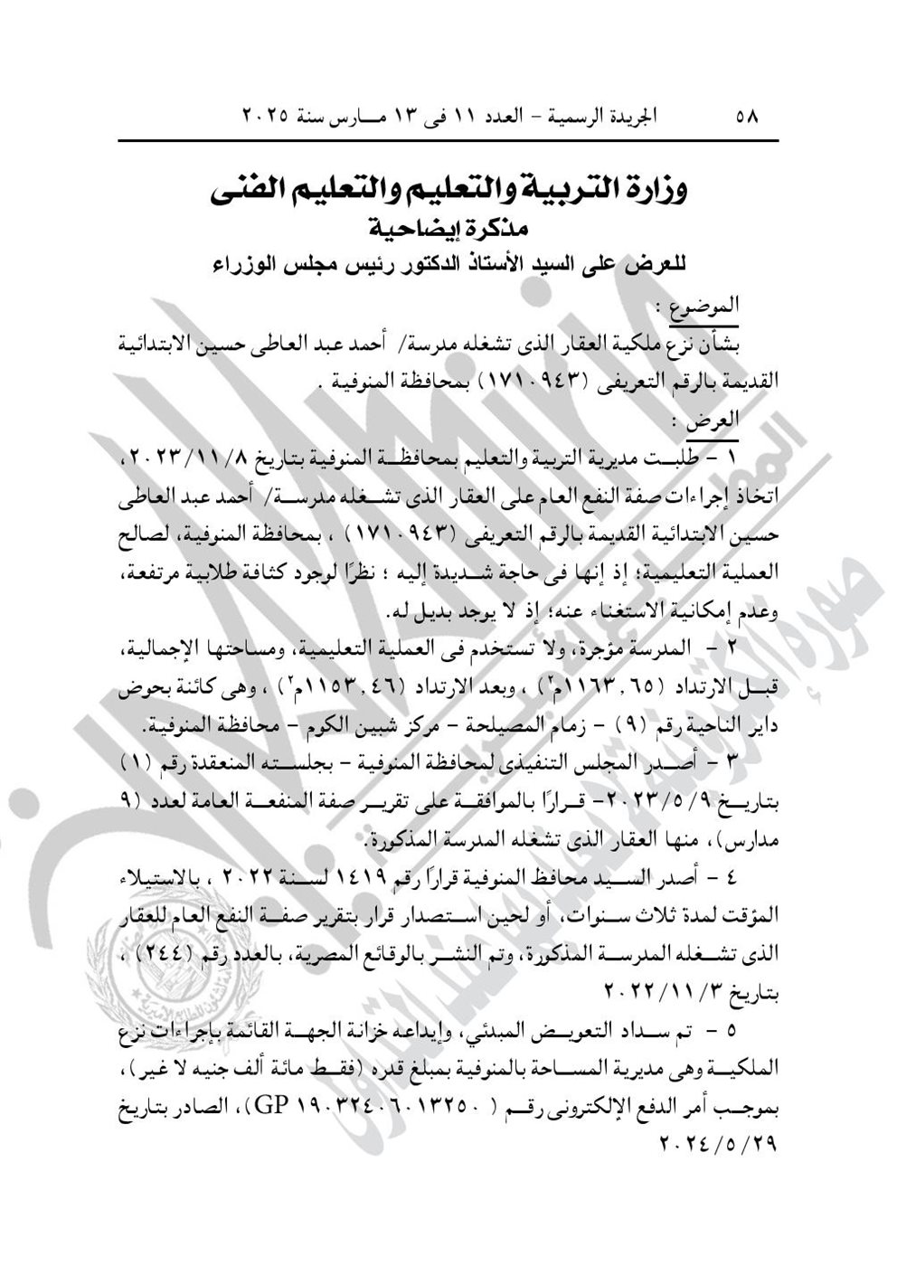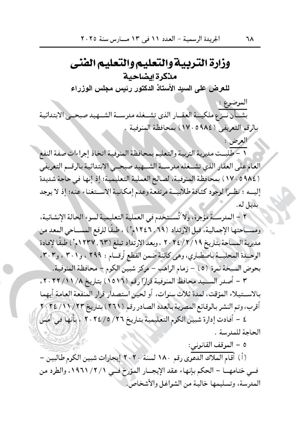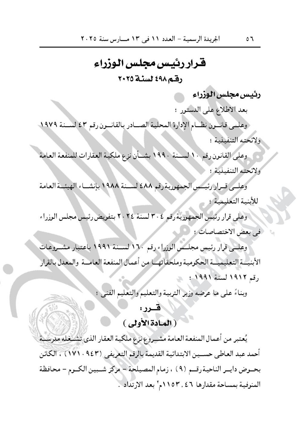- قرار رئيس مجلس الوزراء رقم 498 لسنة 2025، باعتبار مشروع نزع ملكية العقار الذى تشغله مدرسة أحمد عبد العاطى حسين الابتدائية القديمة، الكائن بحوض داير الناحية رقم (9) زمام المصيلحة، مركز شبين الكوم محافظة المنوفية، من أعمال المنفعة العامة. ويستولى بطريق التنفيذ المباشر على كامل أرض ومبانى العقار.