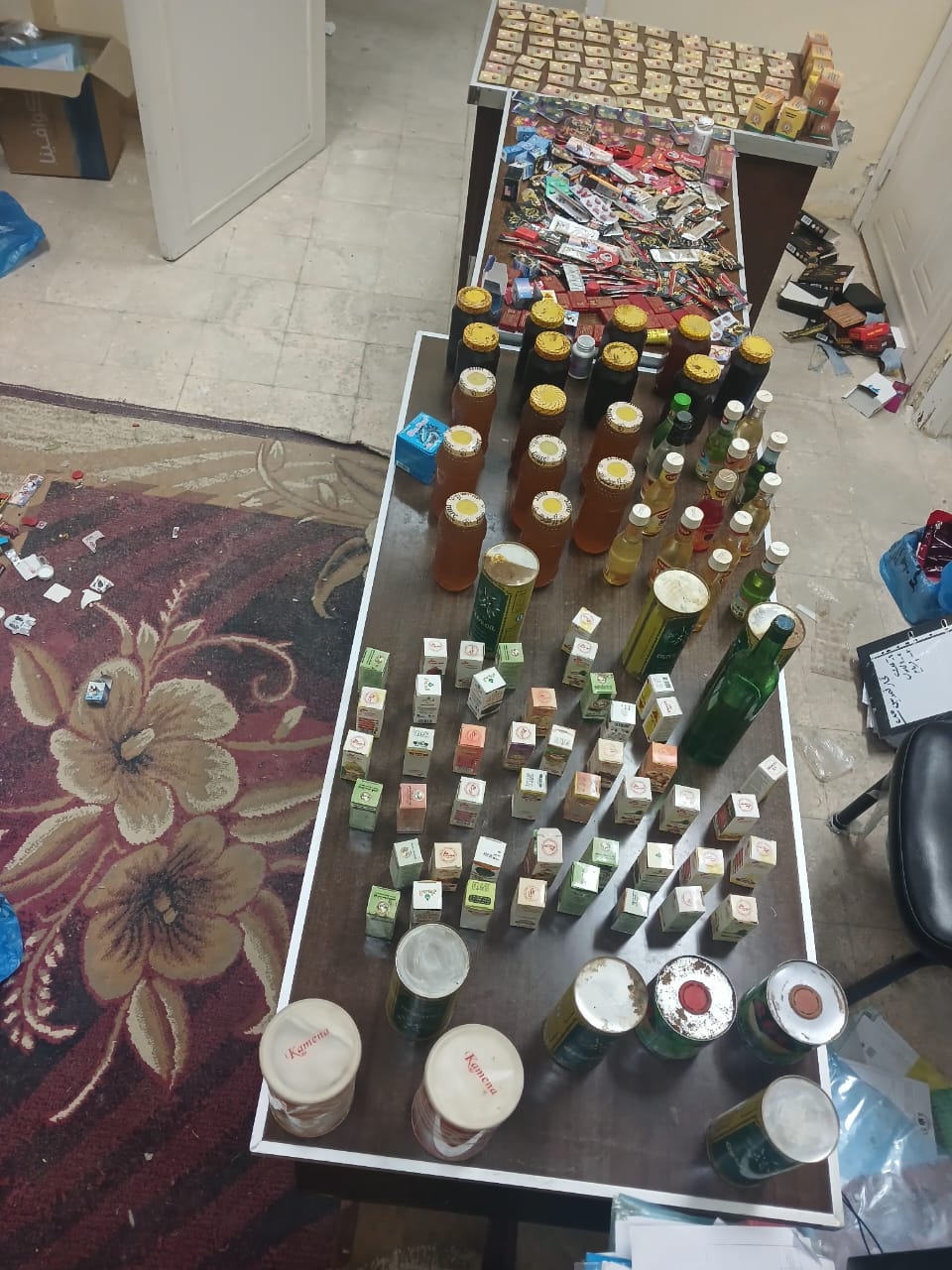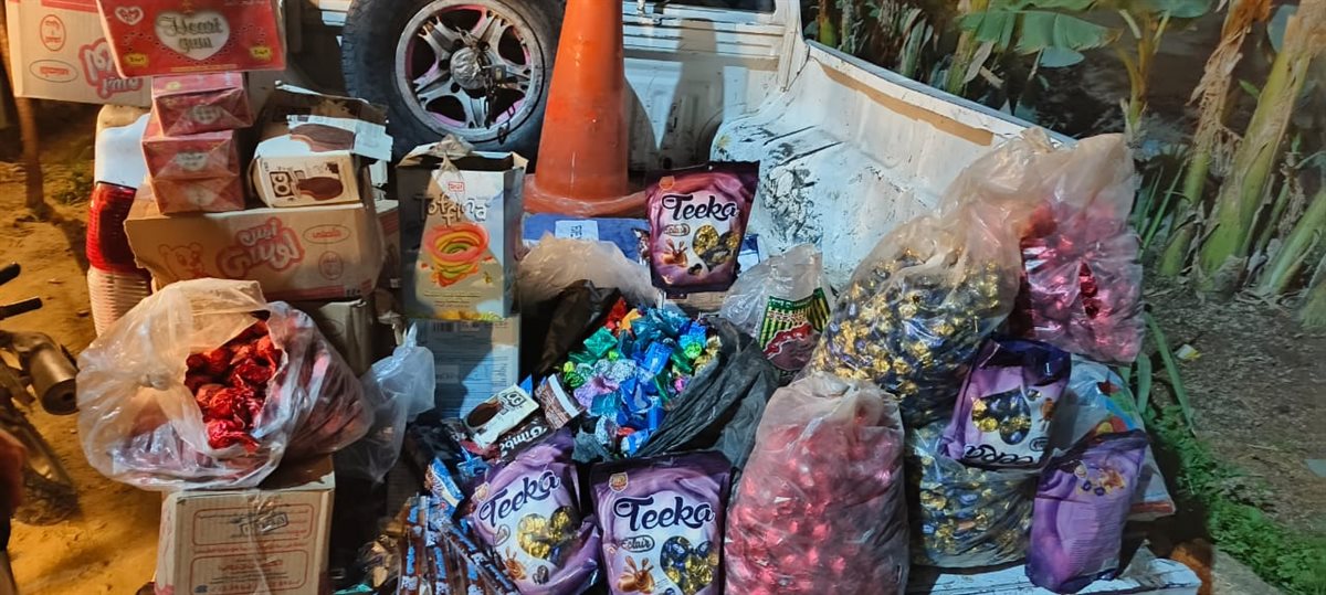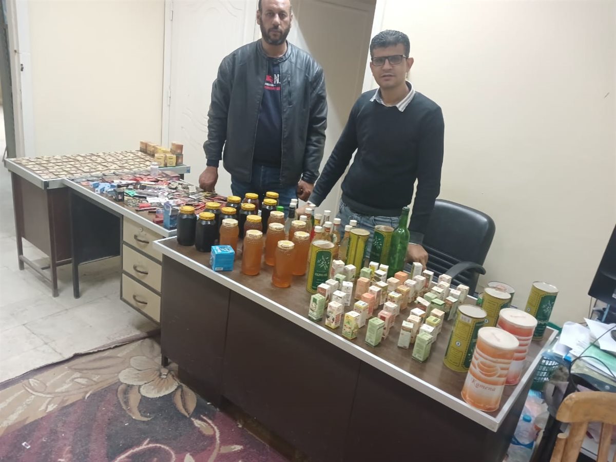 كما تم التحفظ علي 30 عبوة منتجات عنايه شخصية منتهية الصلاخية، و17 عبوة عسل أبيض زنة العبوة كيلو حرام واحد، بدون أية بيانات تفيد تاريخ الانتاج أو جهة المصدر أو مدة الصلاحية، و130 عبوة زيوت شعر وكريمات بدون تواريخ الإنتاج، و2700 قطعة شيكولاته منتهي الصلاحية، و540 كيس لوليتا مجهول المصدر، و68 علبة سجائر مختلفة الأنواع مجهولة المصدر.