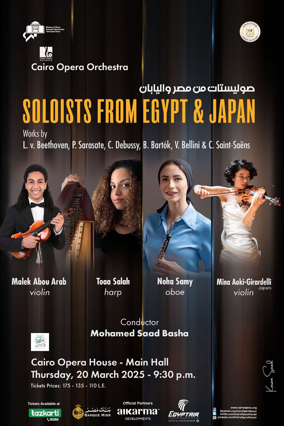 تقيم دار الأوبرا المصرية برئاسة الدكتور علاء عبد السلام حفلًا بالتعاون مع السفارة اليابانية بعنوان "صوليستات من مصر واليابان" بمناسبة مرور ثلاثين عامًا على إنشاء مؤسسة اليابان بالقاهرة، ويحييه أوركسترا أوبرا القاهرة بقيادة المايسترو محمد سعد باشا بمشاركة نخبة من العازفين المتميزين منهم اليابانية مينا أوكى جيرارديللى - والمصريين مالك أبو عرب ( فيولينة )، نهى سامى ( اوبوا )، تقى صلاح ( هارب ) وذلك في التاسعة والنصف مساء الخميس ٢٠ مارس على المسرح الكبير.