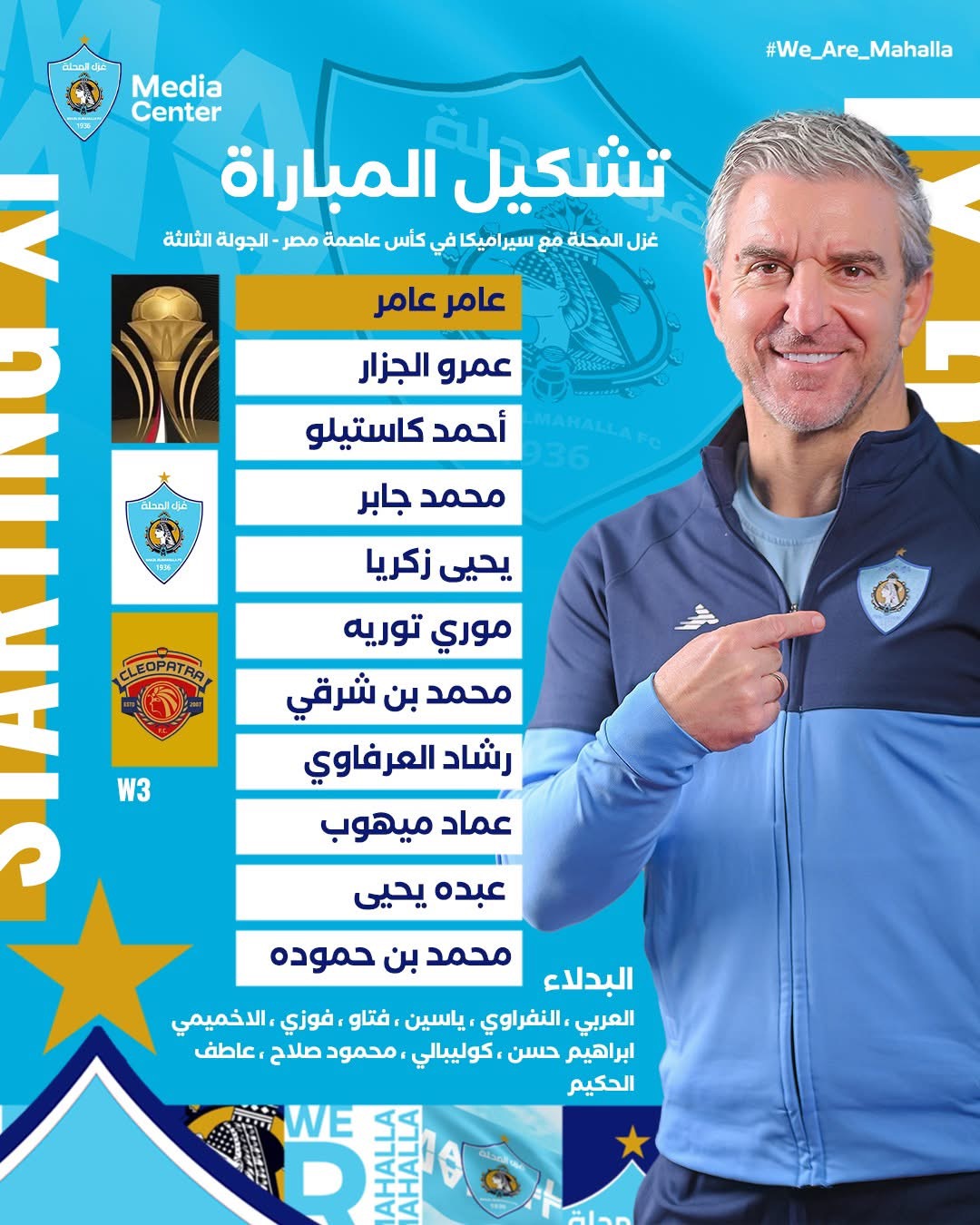 كأس عاصمة مصر، أعلن بابا فاسيليو مدرب فريق غزل المحلة تشكيل فريقه لمواجهة نظيره فريق سيراميكا كليوباترا، المقرر لها في التاسعة والنصف مساء اليوم السبت على استاد هيئة قناة السويس في إطار منافسات الجولة الثالثة من بطولة كأس عاصمة مصر.