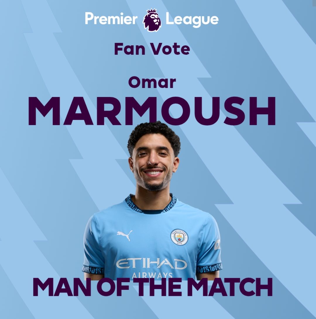 وحصد عمر مرموش لاعب منتخبنا الوطني المحترف ضمن صفوف مانشستر سيتي، جائزة أفضل لاعب في المباراة.