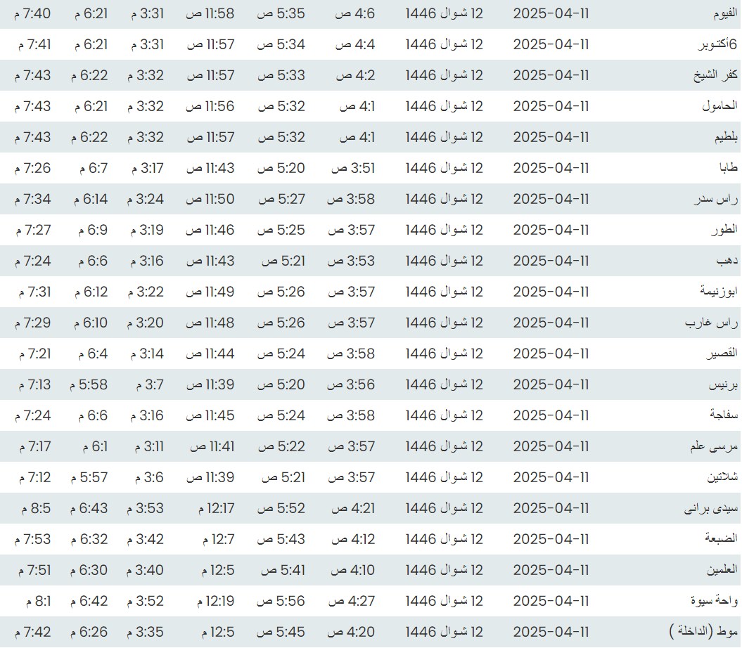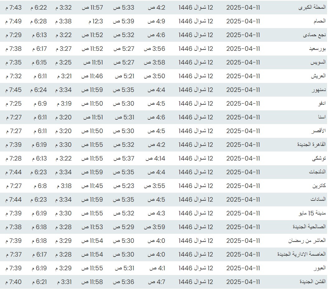 وفيما يلي مواقيت الصلاة، لعدد من مدن ومحافظات الجمهورية من واقع بيانات الهيئة العامة للمساحة