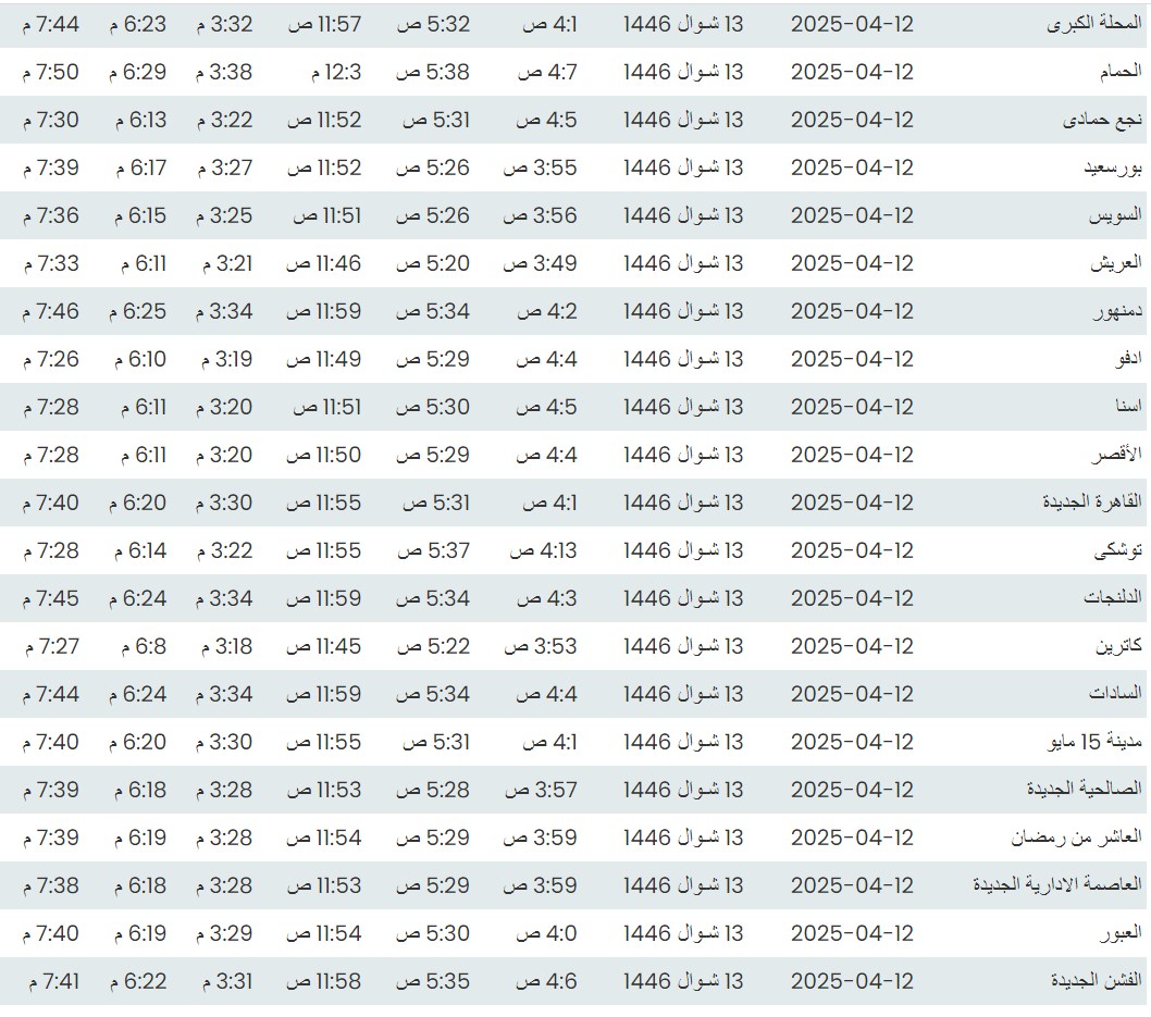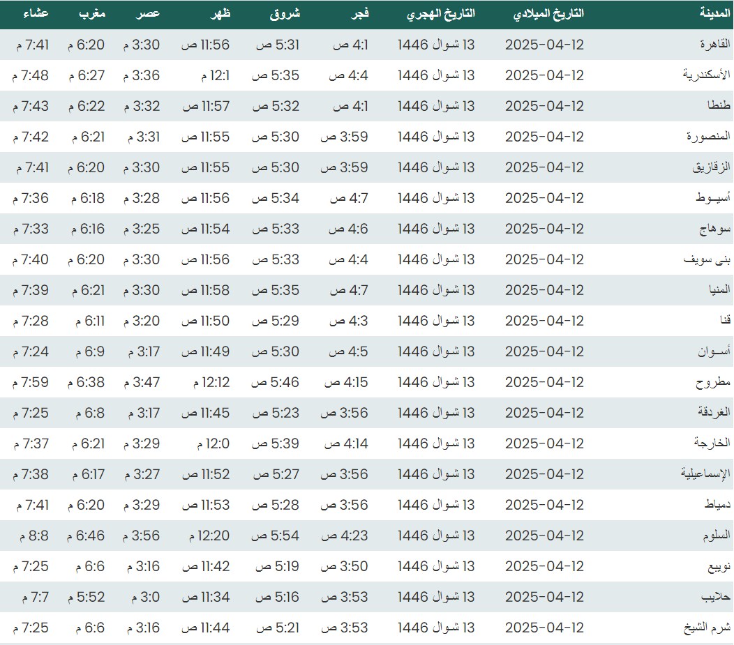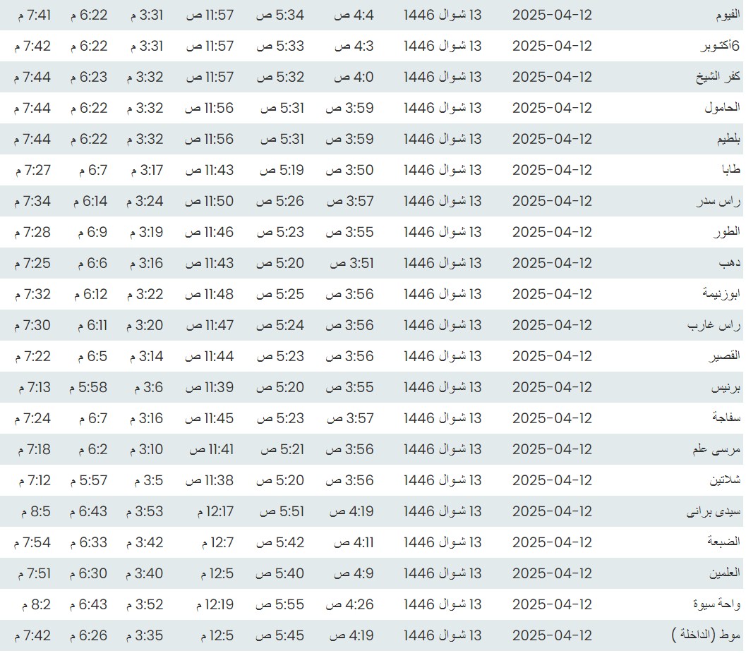 وفيما يلي مواقيت الصلاة، لعدد من مدن ومحافظات الجمهورية من واقع بيانات الهيئة العامة للمساحة