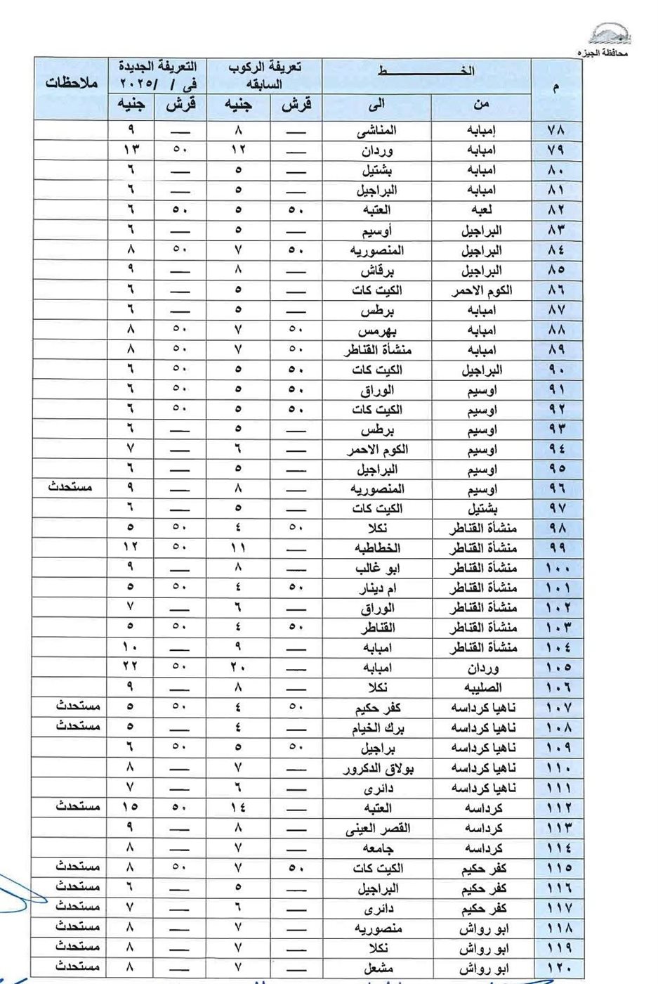 الجيزة تنشر التعريفة الجديدة لخطوط السير بمواقف الأقاليم