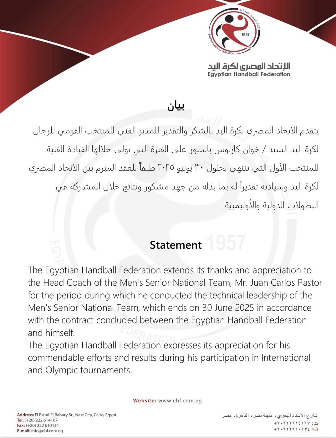 وأعلن الاتحاد المصري لكرة اليد، رحيل الإسباني خوان كارلوس باستور عن منصبه، كمدير فني للمنتخب الأول، عقب انقضاء عقده بنهاية شهر يونيو المقبل.