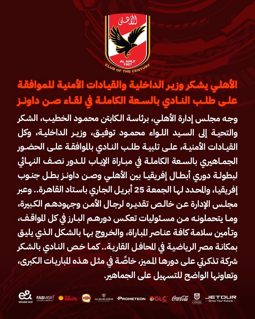 كما وجه مجلس إدارة الأهلي، برئاسة الكابتن محمود الخطيب، الشكر والتحية إلى السيد اللواء محمود توفيق، وزير الداخلية، وكل القيادات الأمنية، على تلبية طلب النادي بالموافقة على الحضور الجماهيري بالسعة الكاملة في مباراة الإياب للدور نصف النهائي لبطولة دوري أبطال إفريقيا بين الأهلي وصن داونز بطل جنوب إفريقيا، والمحدد لها الجمعة 25 أبريل الجاري باستاد القاهرة.