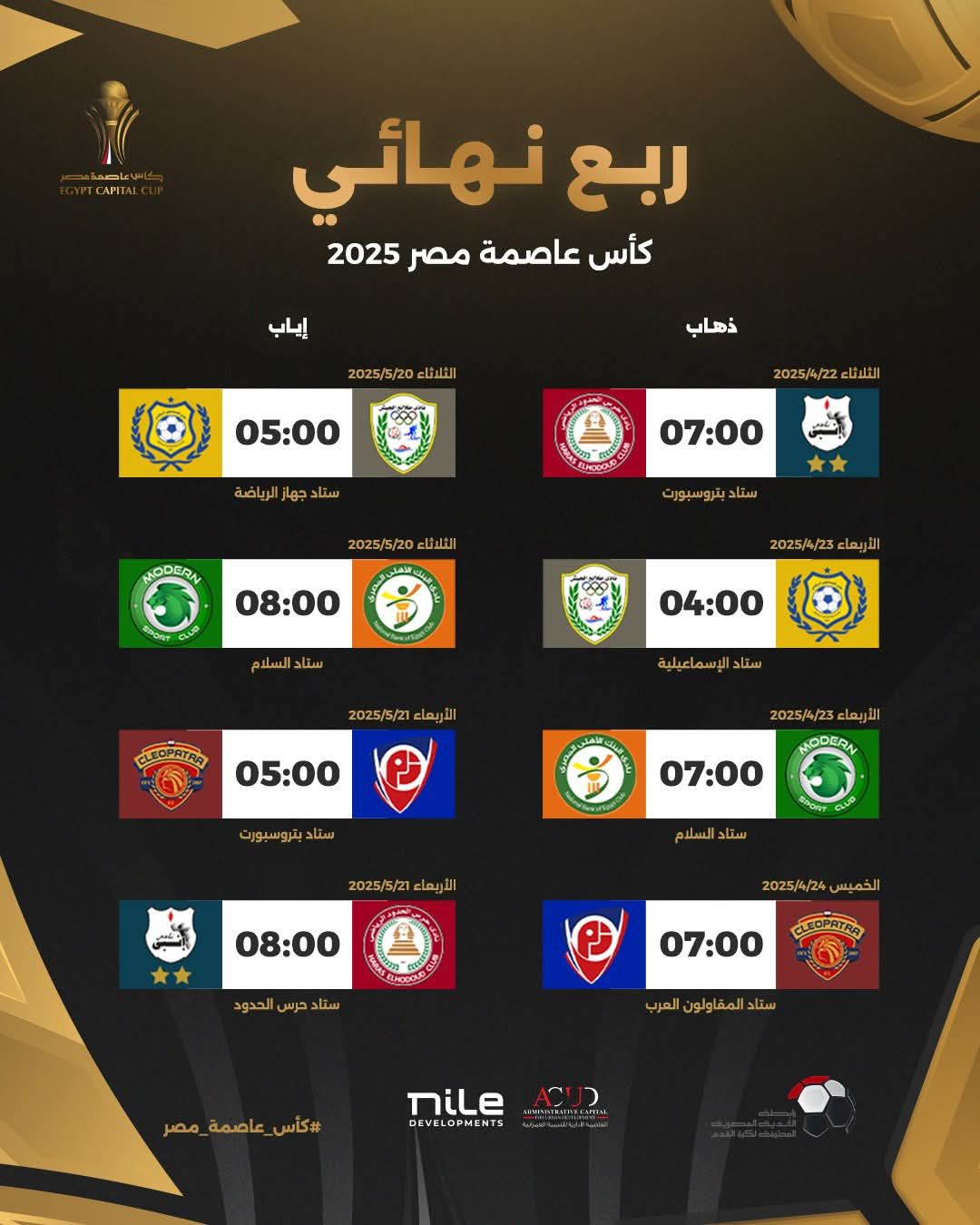 وقررت رابطة الأندية إقامة مباريات جولة الذهاب للدور ربع النهائي من كأس عاصمة مصر يومي 22 أبريل و23 أبريل الجاري، على أن تُلعب مواجهات الإياب يومي 20 و21 مايو المقبل.