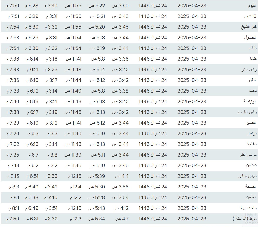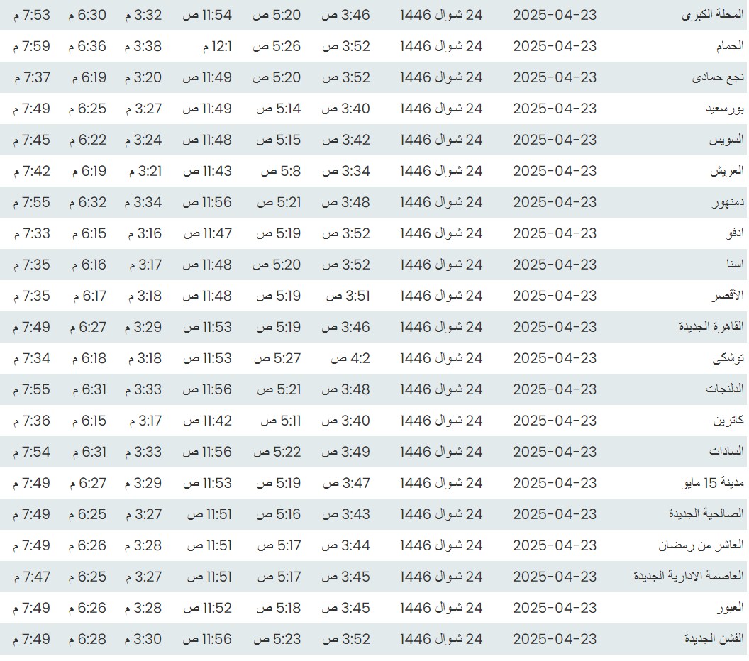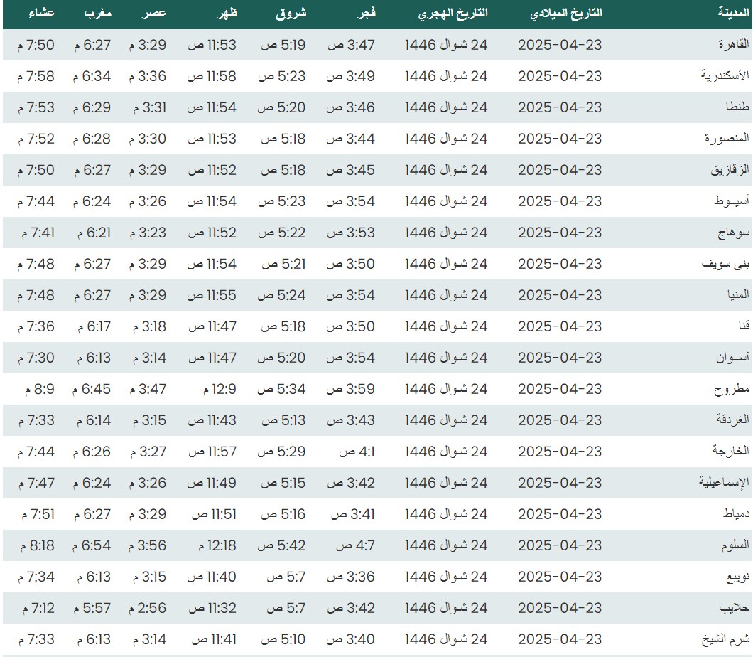 وفيما يلي مواقيت الصلاة، لعدد من مدن ومحافظات الجمهورية من واقع بيانات الهيئة العامة للمساحة