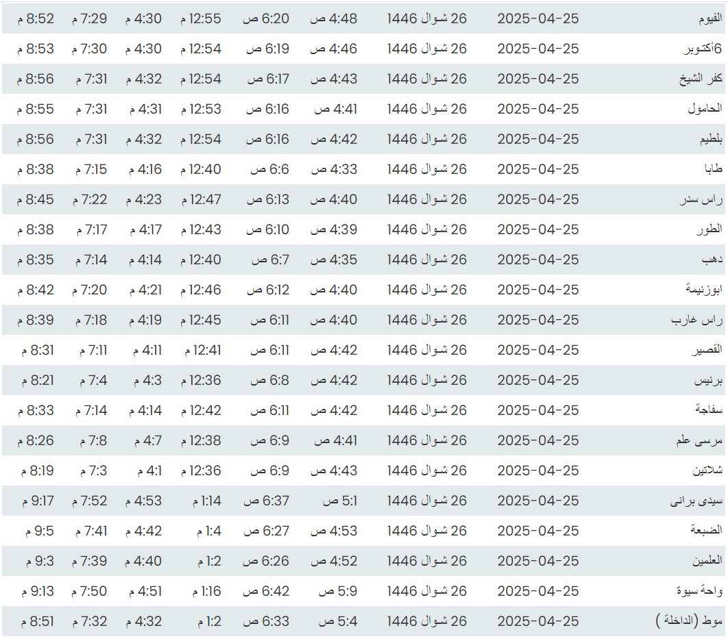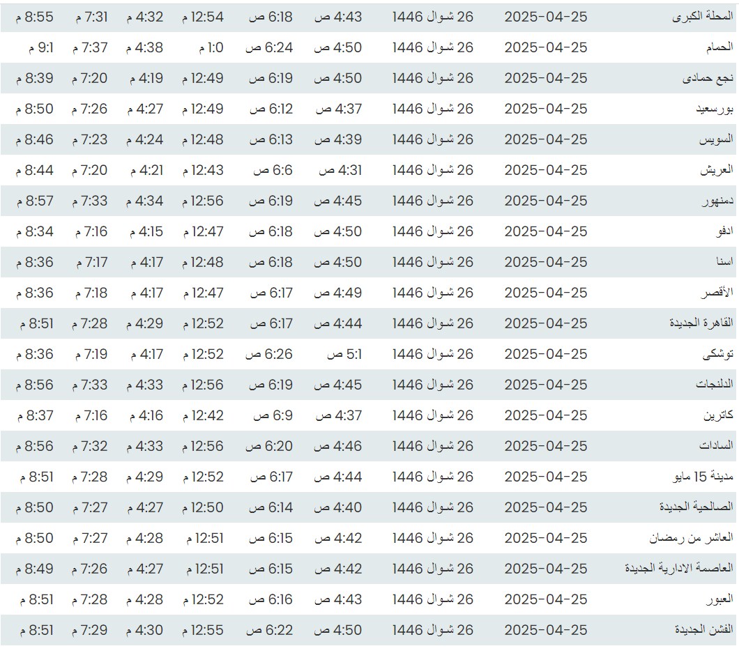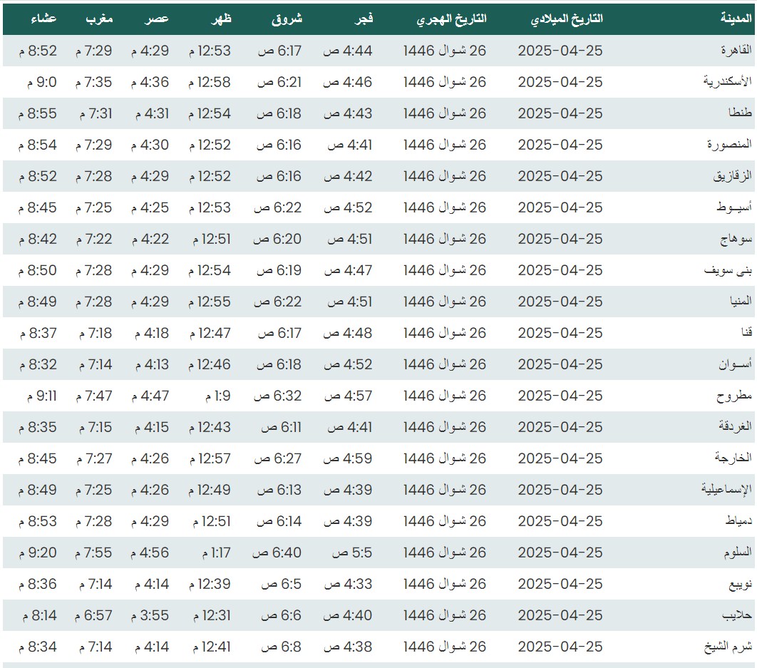 وفيما يلي مواقيت الصلاة، لعدد من مدن ومحافظات الجمهورية من واقع بيانات الهيئة العامة للمساحة