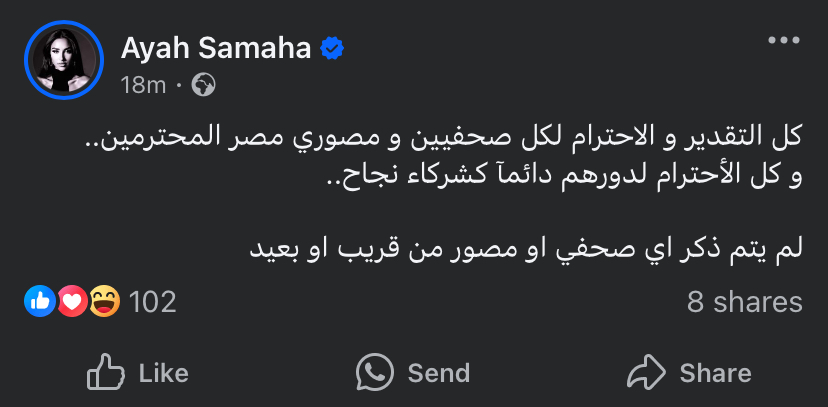 وكتبت آية سماحة، قائلة: “كل التقدير والاحترام لكل صحفيين ومصوري مصر المحترمين.. وكل الاحترام لدورهم دائما كشركاء نجاح.. لم يتم ذكر أي صحفي أو مصور من قريب أو بعيد”.