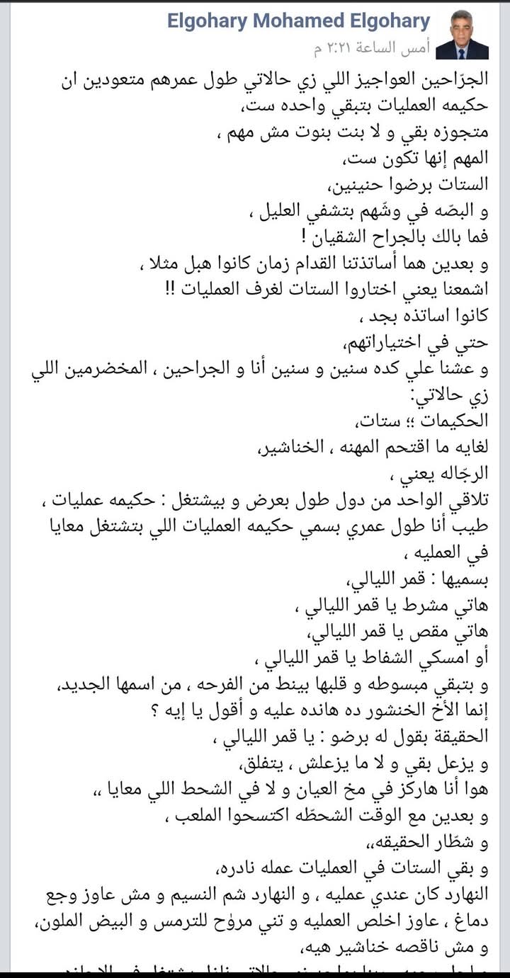 حيث وصف الرجال العاملين بمهنة التمريض بأنهم “ خناشير” ووصف السيدات والفتيات العاملات بمهنة التمريض بأنهن "قمر الليالي" وأن مهنة التمريض يجب أن تقتصر على السيدات فقط وهي مهنة منذ نشأتها تليق بالسيدات.