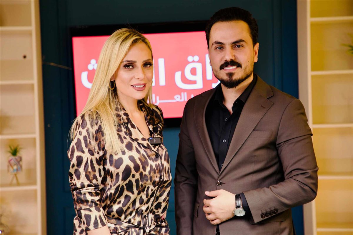 وقبل نزار الفارس يد ريم البارودي أثناء كواليس تصوير حلقتها في برنامج العراق الحدث.