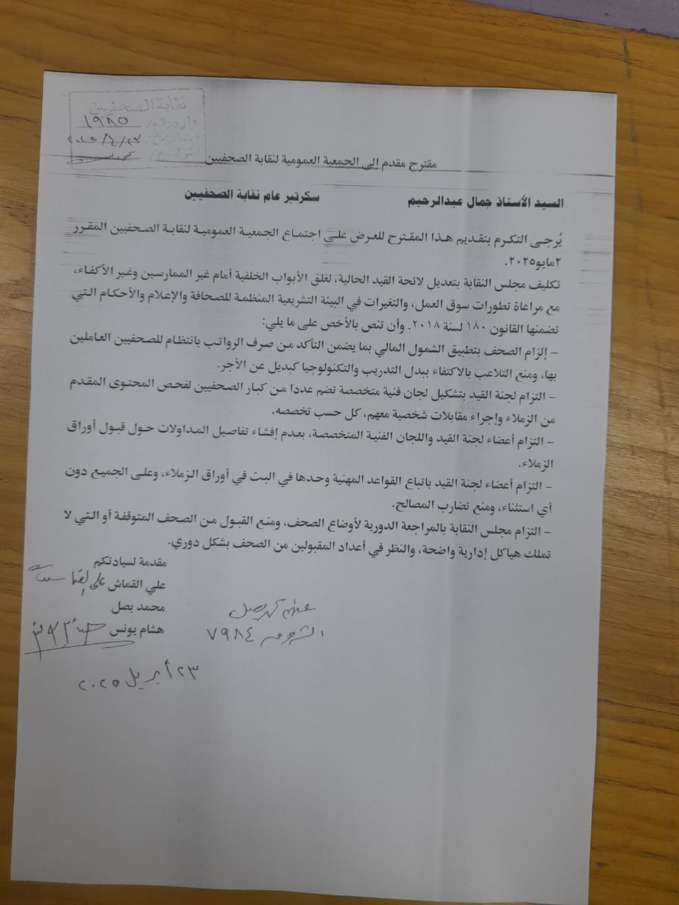 وقال المتقدمين: "نتقدم بمقترح للجمعية العمومية، التي من المقرر لها الانعقاد في ٢ مايو المقبل، تكليف مجلس النقابة بتعديل لائحة القيد الحالية، لغلق الأبواب الخلفية أمام غير الممارسين وغير الأكفاء، مع مراعاة تطورات سوق العمل، والتغيرات في البيئة التشريعية المنظمة للصحافة والإعلام والأحكام التي تضمنها القانون ١٨٠ لسنة ٢٠١٨.