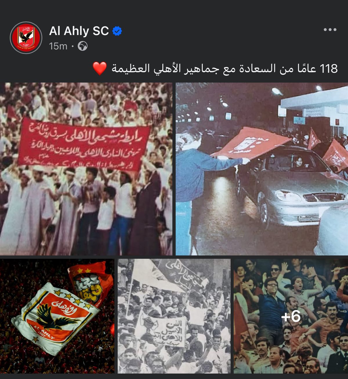ونشر حساب الأهلي عددا من الصور لمشجعي النادي الأهلي وكتب عليها: “118 عامًا من السعادة مع جماهير الأهلي العظيمة”.