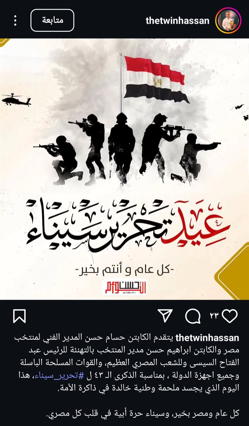 وكتب حسام حسن عبر صفحته الشخصية انستجرام: “يتقدم الكابتن حسام حسن المدير الفني لمنتخب مصر والكابتن إبراهيم حسن مدير المنتخب بالتهنئة للرئيس عبد الفتاح السيسي وللشعب المصري العظيم، والقوات المسلحة الباسلة وجميع أجهزة الدولة، بمناسبة الذكرى الـ ٤٣ لـ #تحرير_سيناء، هذا اليوم الذي يجسد ملحمة وطنية خالدة في ذاكرة الأمة”.