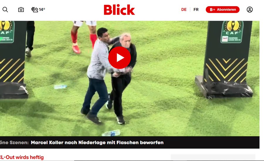 وقالت الصحيفة السويسرية أن مارسيل كولر تعرض للرشق بزجاجات المياه من قبل الجماهير، ويواجه خطر الإقالة بعد الخروج المؤلم من نصف نهائي دوري أبطال إفريقيا.