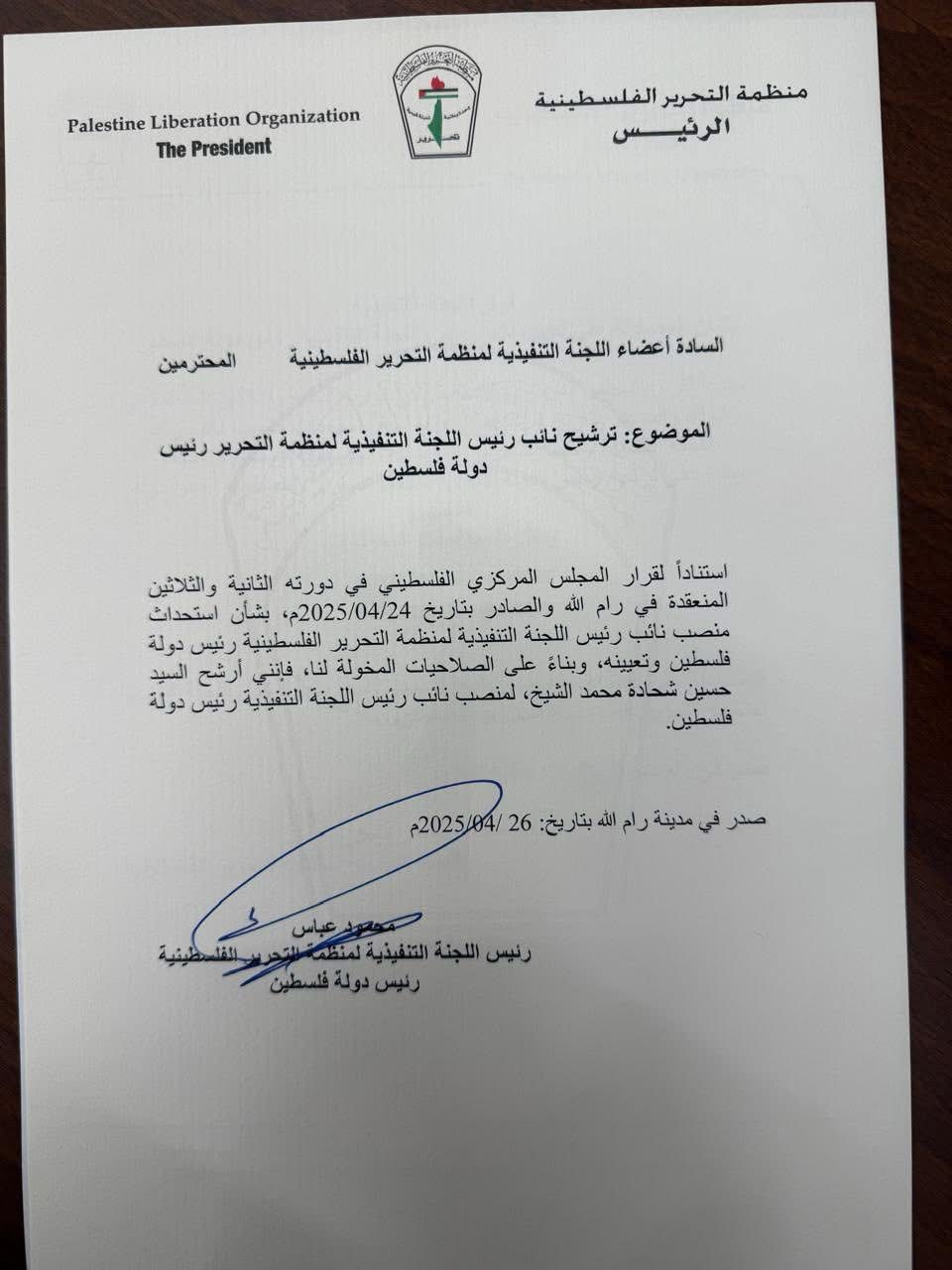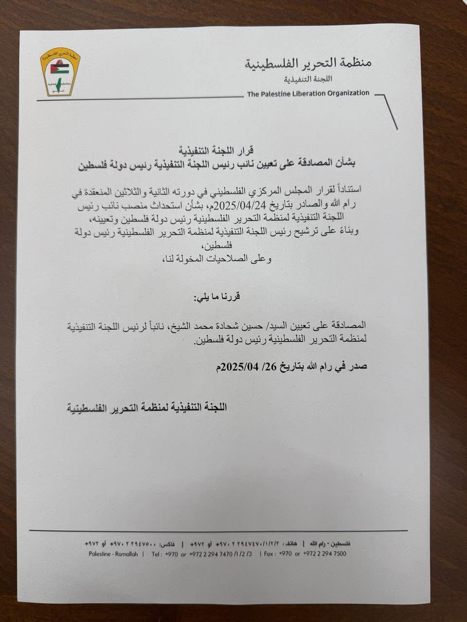 صادقت اللجنة التنفيذية لمنظمة التحرير على تعيين حسين الشيخ، نائبا لرئيس السلطة ونائبا لرئيس اللجنة التنفيذية وذلك بعد ترشيحه من قبل محمود عباس.