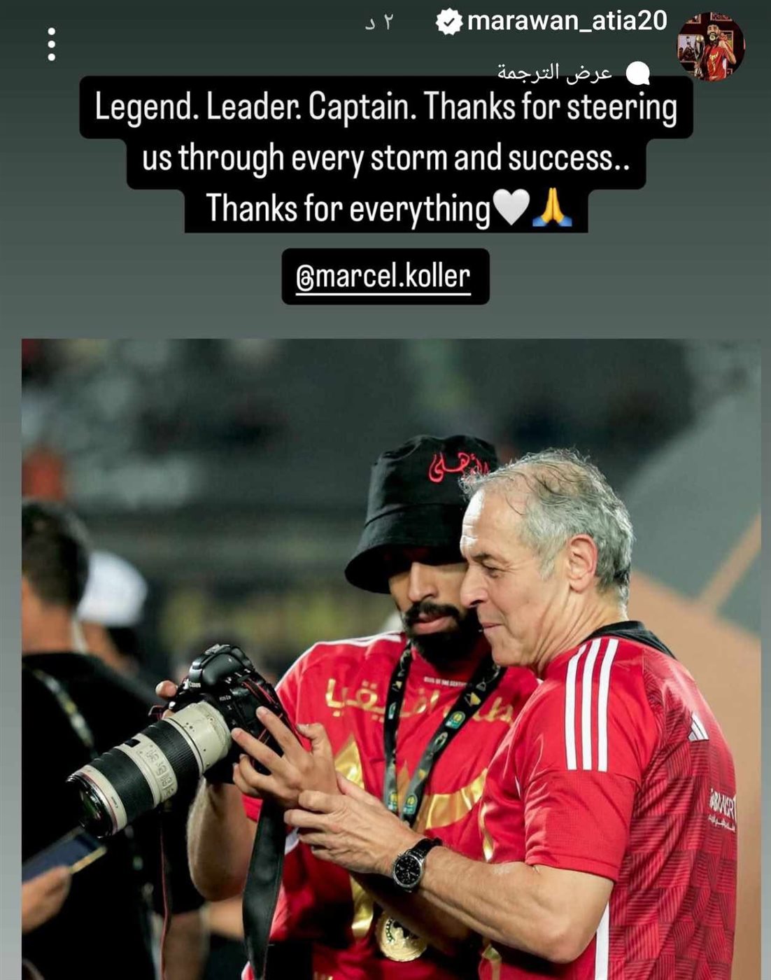 ونشر مروان عطية ستوري عبر حسابه علي إنستجرام صورة له رفقة كولر وكتب عليها: "أسطورة. قائد. كابتن. شكرًا لك على قيادتنا خلال كل عاصفة وكل نجاح.. شكرًا لك على كل شيء".