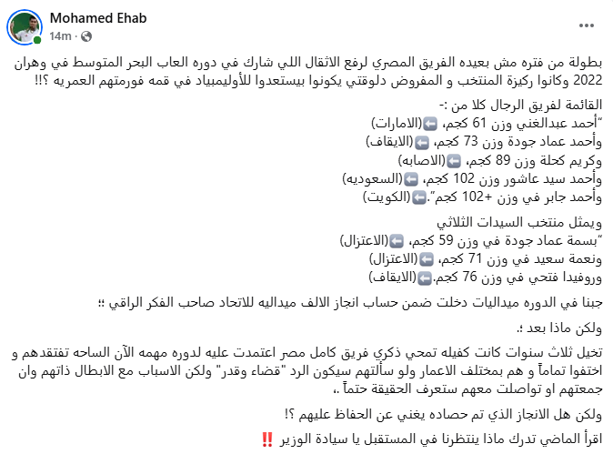 وتحدث “إيهاب” من خلال صفحته على موقع التواصل الاجتماعي “فيس بوك”، عن مشاركة منتخب مصر في منافسات دورة ألعاب البحر المتوسط، والتي أقيمت في مدينة وهران الجزائرية عام 2022.