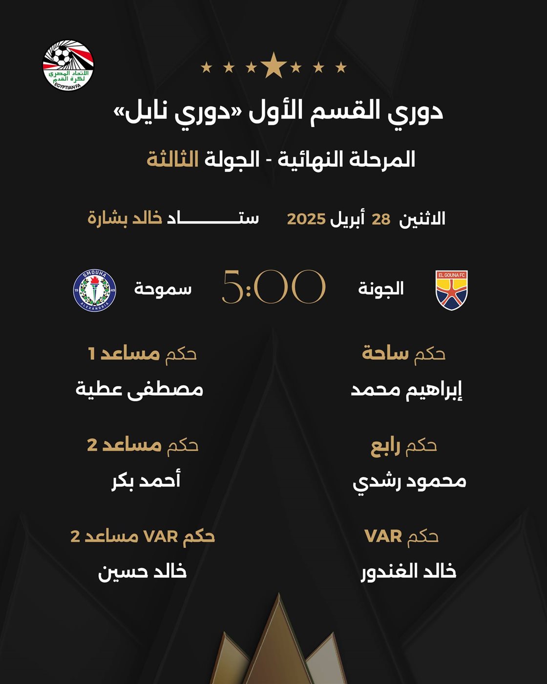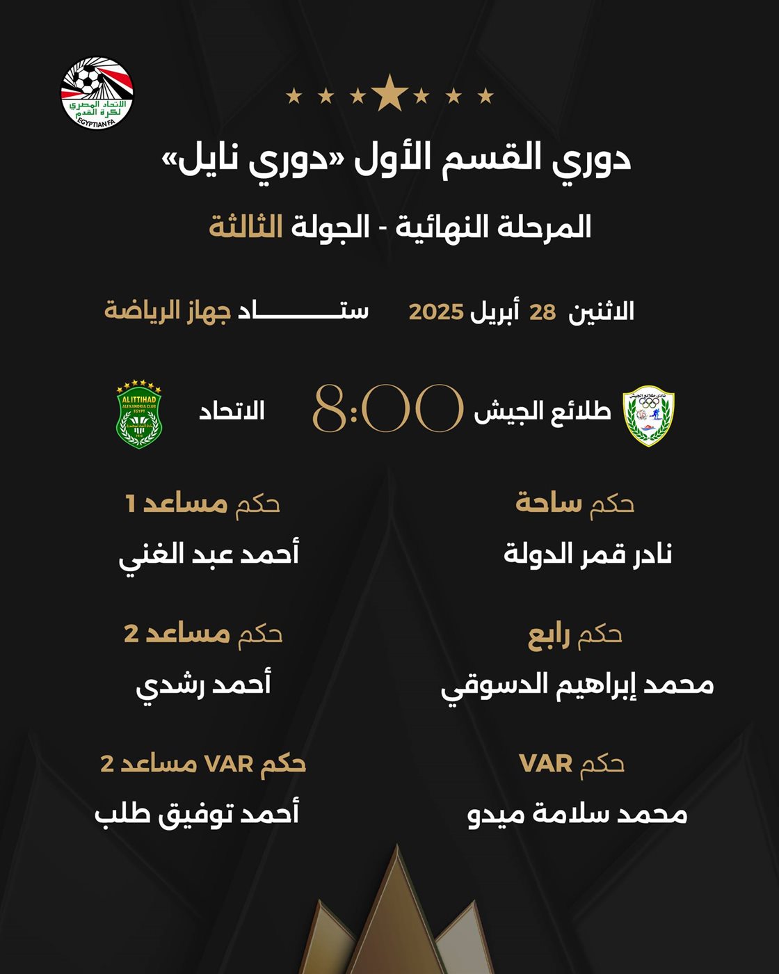 الدوري المصري، أعلنت لجنة الحكام الرئيسية باتحاد الكرة حكام مباريات الجولة الثالثة من المرحلة النهائية لـ الدوري المصري وأبرزها طلائع الجيش ضد الاتحاد السكندري