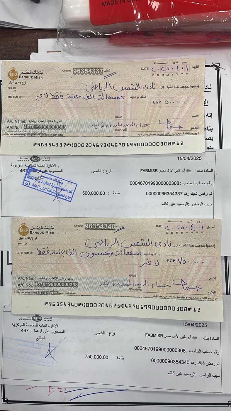 قرر مجلس إدارة نادي الشمس برئاسة أسامة أبوزيد اتخاذ كافة الإجراءات القانونية ضد مجلس إدارة نادى الزمالك برئاسة حسين لبيب، بسبب رد الشيكات المستحقات لنادى الشمس من القسط الأخير الخاص بصفقتي اللاعبين يوسف ناجى إميل وتقى الله مدحت؛ بعد اكتشاف عدم وجود رصيد فى الحساب البنكى الخاص بنادى الزمالك.