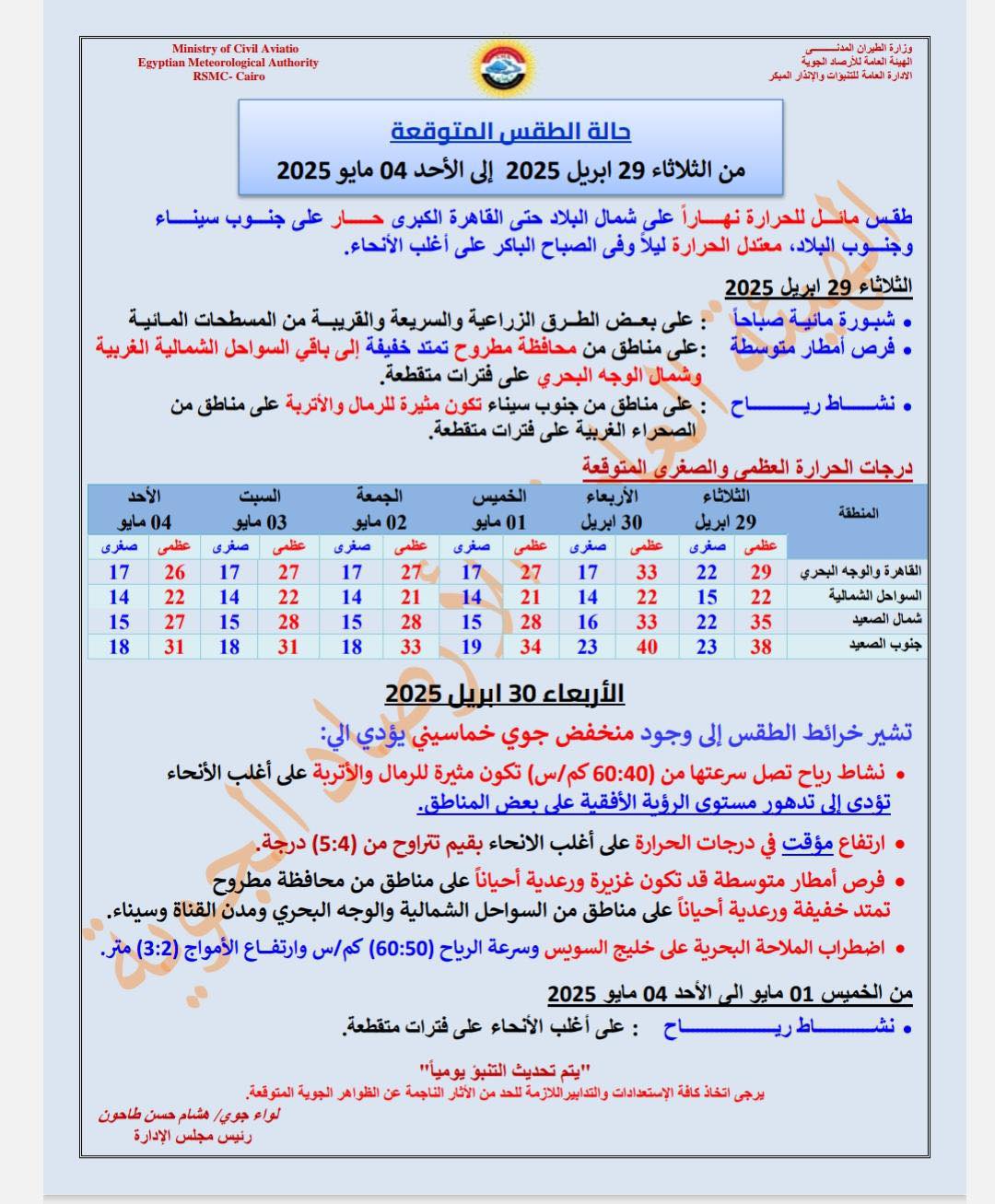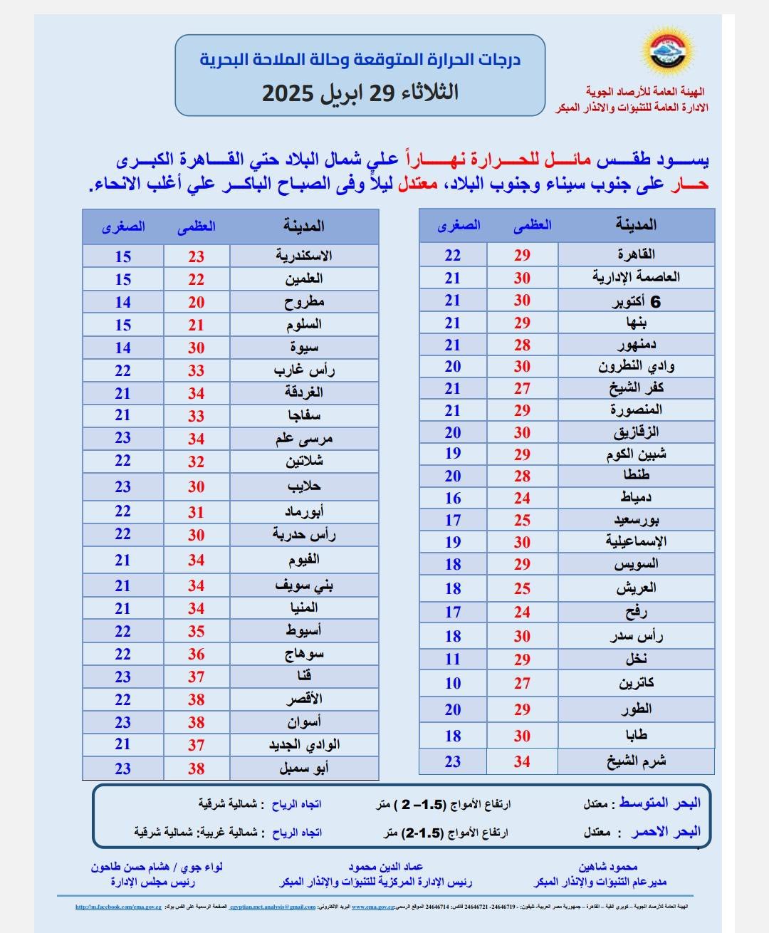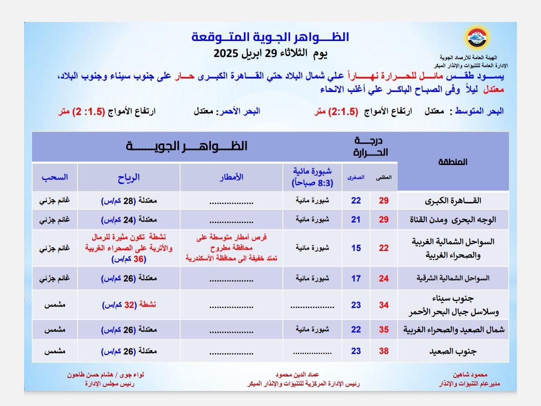 وتوقعت الأرصاد أن يسود اليوم الثلاثاء 29 أبريل 2025، طقس مائل للحرارة نهارًا على شمال البلاد حتى القاهرة الكبرى، حار على جنوب سيناء وجنوب البلاد، معتدل الحرارة ليلًا وفي الصباح الباكر على أغلب الأنحاء.